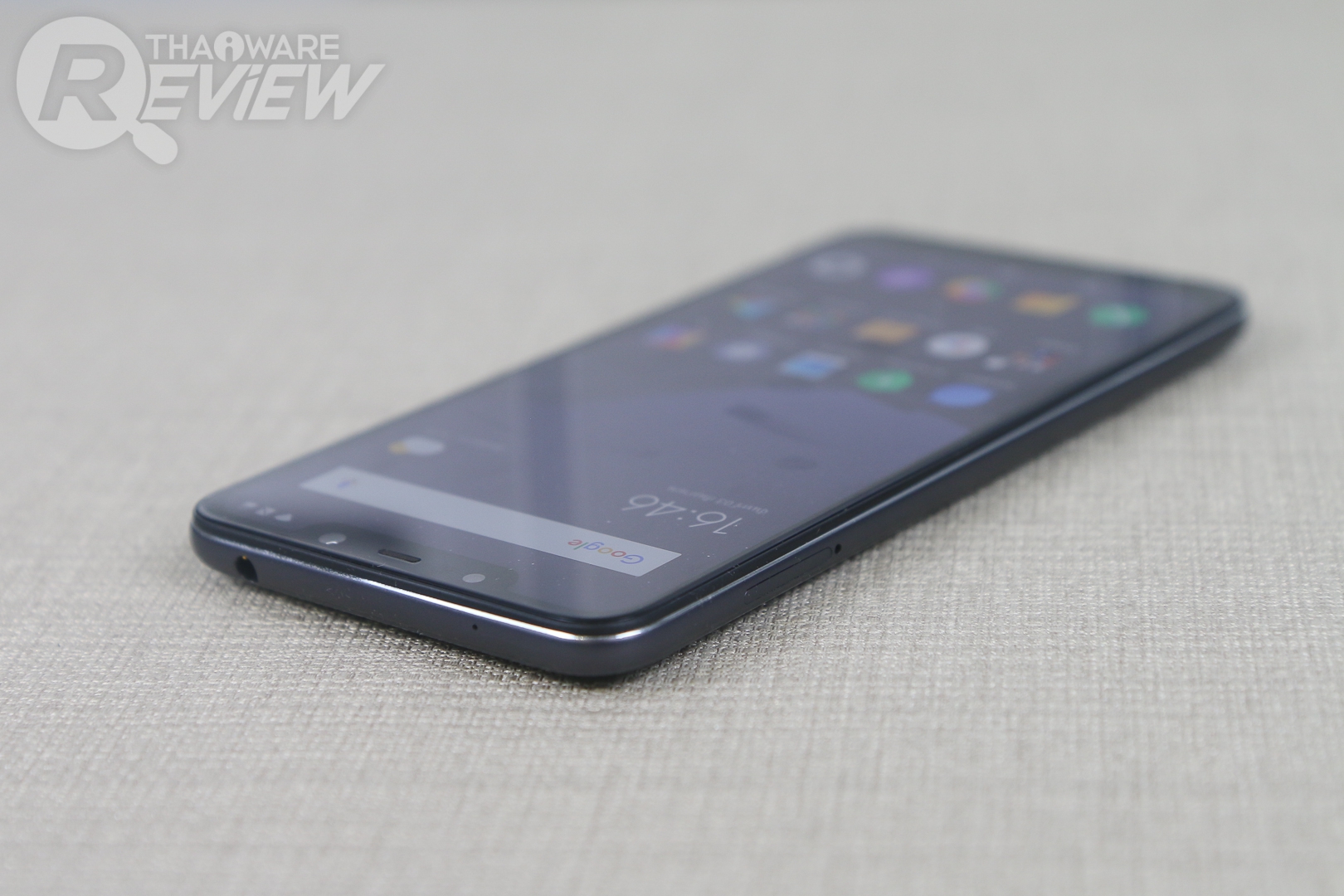 ด้านบนมีช่องเสียบหูฟังมาตรฐาน 3.5 มม. ให้มาด้วย (เยี่ยม) ตำแหน่งของรูเสียบไม่สวยเท่าไหร่ กินพื้นที่ลงมาที่ฝาหลัง ไม่สมมาตรอยู่ตรงกลาง จุดนี้เห็นแล้วหงุดหงิดเล็กๆ ส่วนฝั่งซ้ายจะเป็นที่อยู่ของถาดใส่ซิม เลือกได้ว่าจะใส่ 2 ซิม หรือ 1 ซิม 1 การ์ดไมโครเอสดีก็ได้