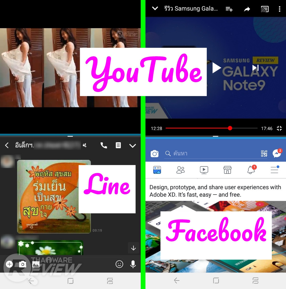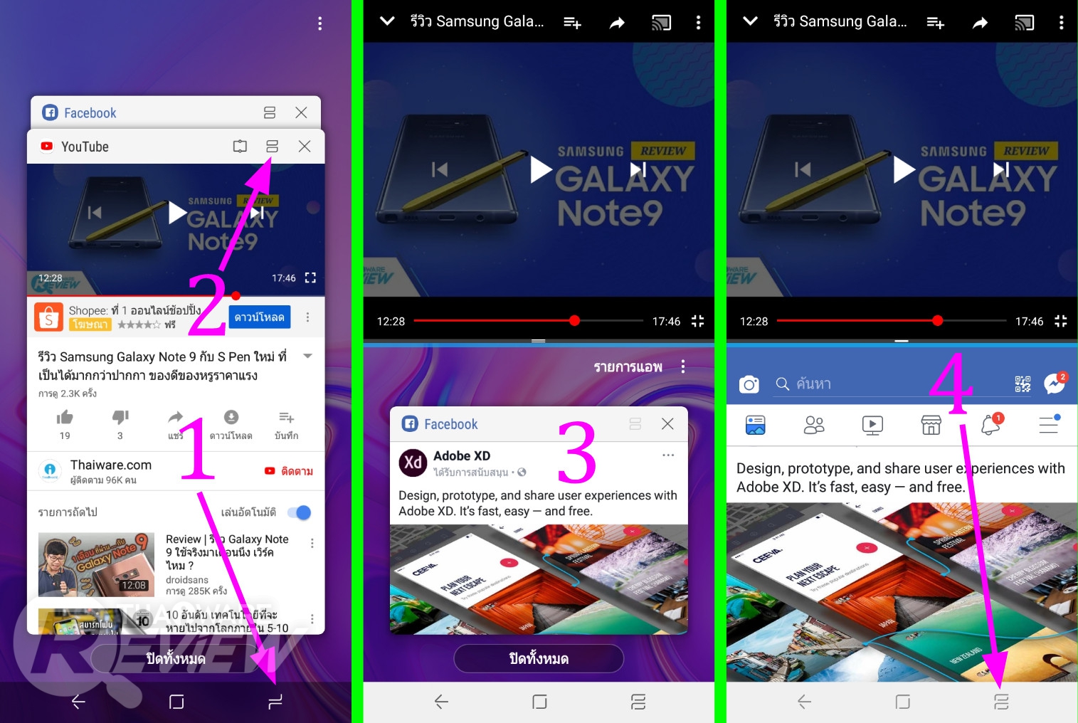 ขั้นตอนแรกให้เปิดแอป YouTube ขึ้นมา แล้วกดที่ปุ่ม Menu (หมายเลข 1) จากนั้นแตะที่ปุ่มแยกหน้าจอ (หมายเลข 2) จากนั้นแอป YouTube ก็จะถูกส่งขึ้นไปที่ซีกบนของหน้าจอตามภาพกลาง ให้เราเลือกแอปฯ ที่จะแสดงในหน้าจอซีกล่าง (หมายเลข 3) อย่างในตัวอย่างนี้เป็นแอปฯ Facebook เราก็จะได้ผลลัพธ์ตามภาพขวา โดยมี YouTube แสดงที่หน้าจอซีกบน และ Facebook แสดงที่หน้าจอซีกล่างตามต้องการ และเมื่อต้องการออกจากการแสดงผลแบบแบ่งซีกหน้าจอ ให้แตะที่ปุ่ม หมายเลข 4