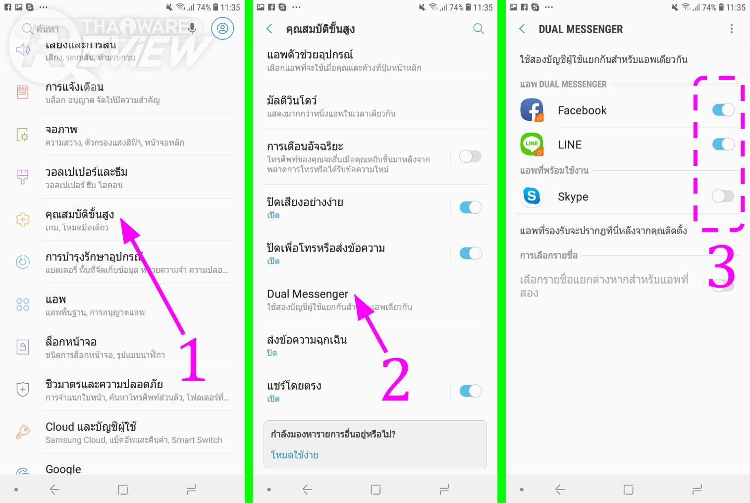 ขั้นแรก ให้ไปที่การ ตั้งค่า ของระบบ Android จากนั้นแตะที่คำสั่ง คุณสมบัติขั้นสูง (หมายเลข 1) ก็จะมายังหน้าจอตามภาพกลาง แตะที่คำสั่ง Dual Messenger (หมายเลข 2) ก็จะมาสู่หน้าจอตามภาพขวา จะมีการแสดงรายชื่อแอปฯ ที่รองรับการทำ Dual Messenger (แอปฯ ต้องมีการติดตั้งลงในเครื่องแล้วถึงจะมีการแสดงรายชื่อ) เราต้องการติดตั้งแอปฯ ตัวที่สองของแอปฯ ตัวไหน ก็แตะเลื่อนเปิดสวิทซ์ที่ด้านท้ายของรายชื่อแอปฯ นั้นได้เลย