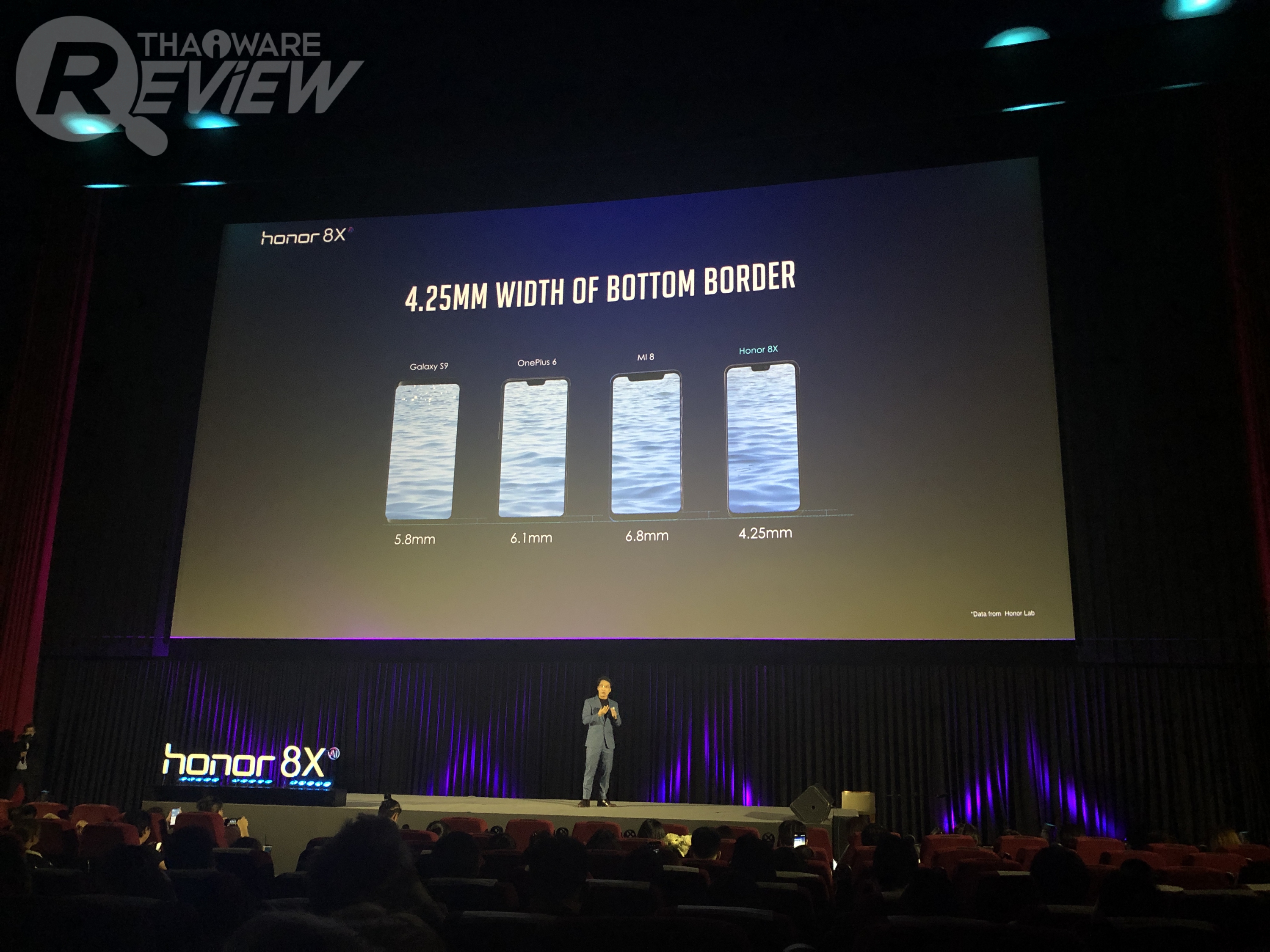 ขอบจอด้านล่าง หรือที่เรียกกันว่า "คาง" ของ Honor 8X ก็เป็นอีกจุดที่ทำได้ดีนะครับ ทำมาได้บางเพียง 4.25 มม. เท่านั้น เมื่อเทียบกับคู่แข่งรายอื่นๆ ที่เป็น Android ด้วยกัน ถือว่าบางกว่ามากพอสมควร