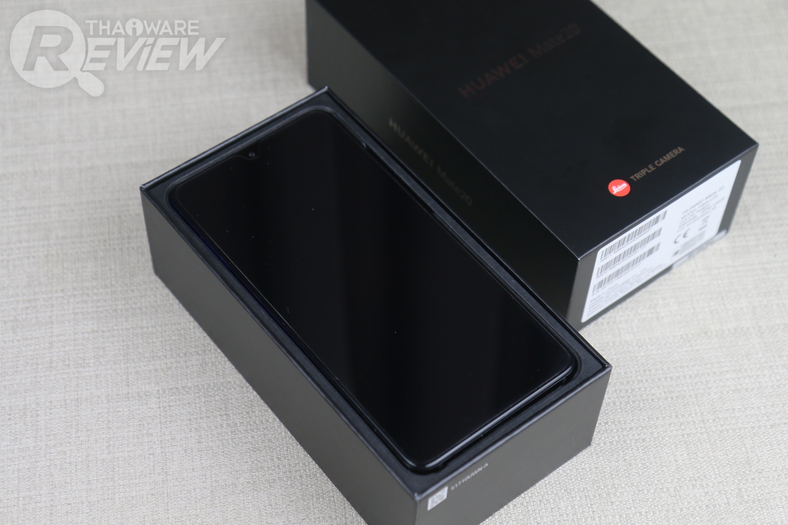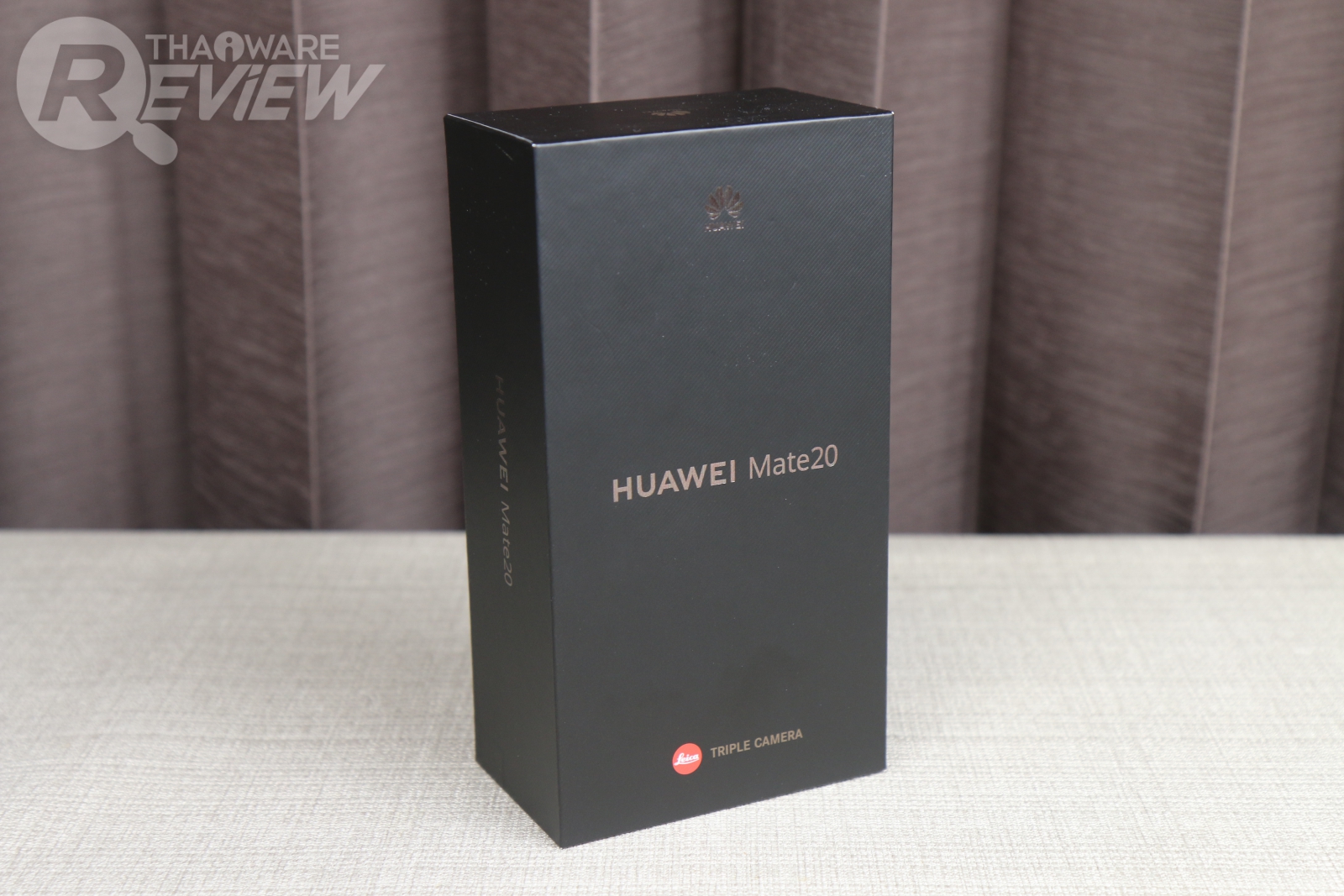ไหนๆ ก็มาทั้งกล่องแล้ว มาสำรวจกล่องแพ็คเกจของ Huawei Mate 20 กันซักหน่อย ตัวกล่องที่บรรจุสมาร์ทโฟนเรือธงในรุ่นนี้มีสีดำด้าน สกรีนโลโก้ด้วยหมึกสีเงินสะท้อนแสง ซึ่งต้องหามุมถ่ายดีๆ ไม่งั้นสีหมึกจะจมหายไปกับสีกล่องเลย