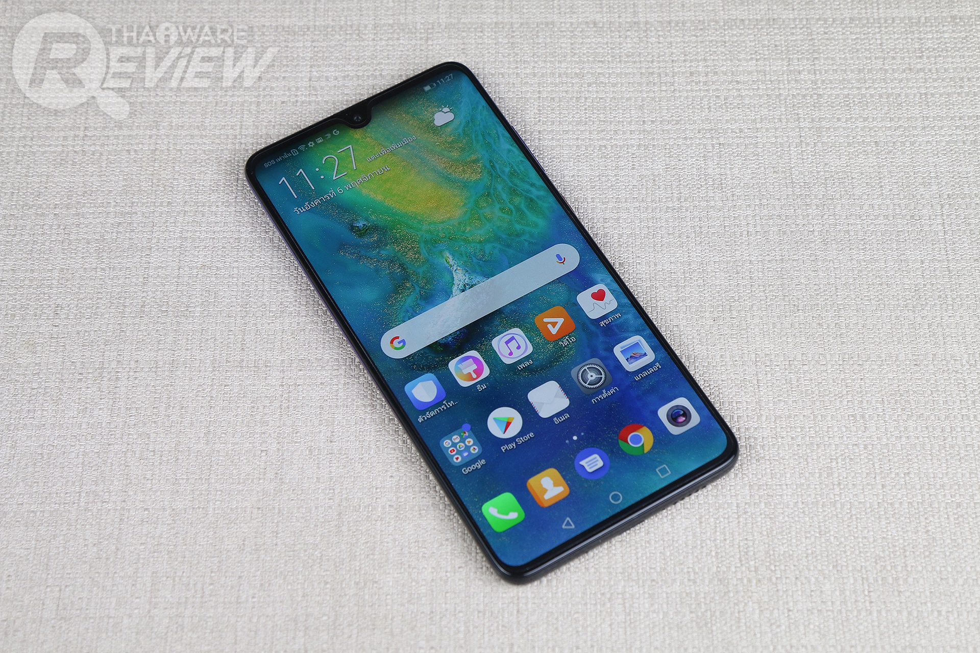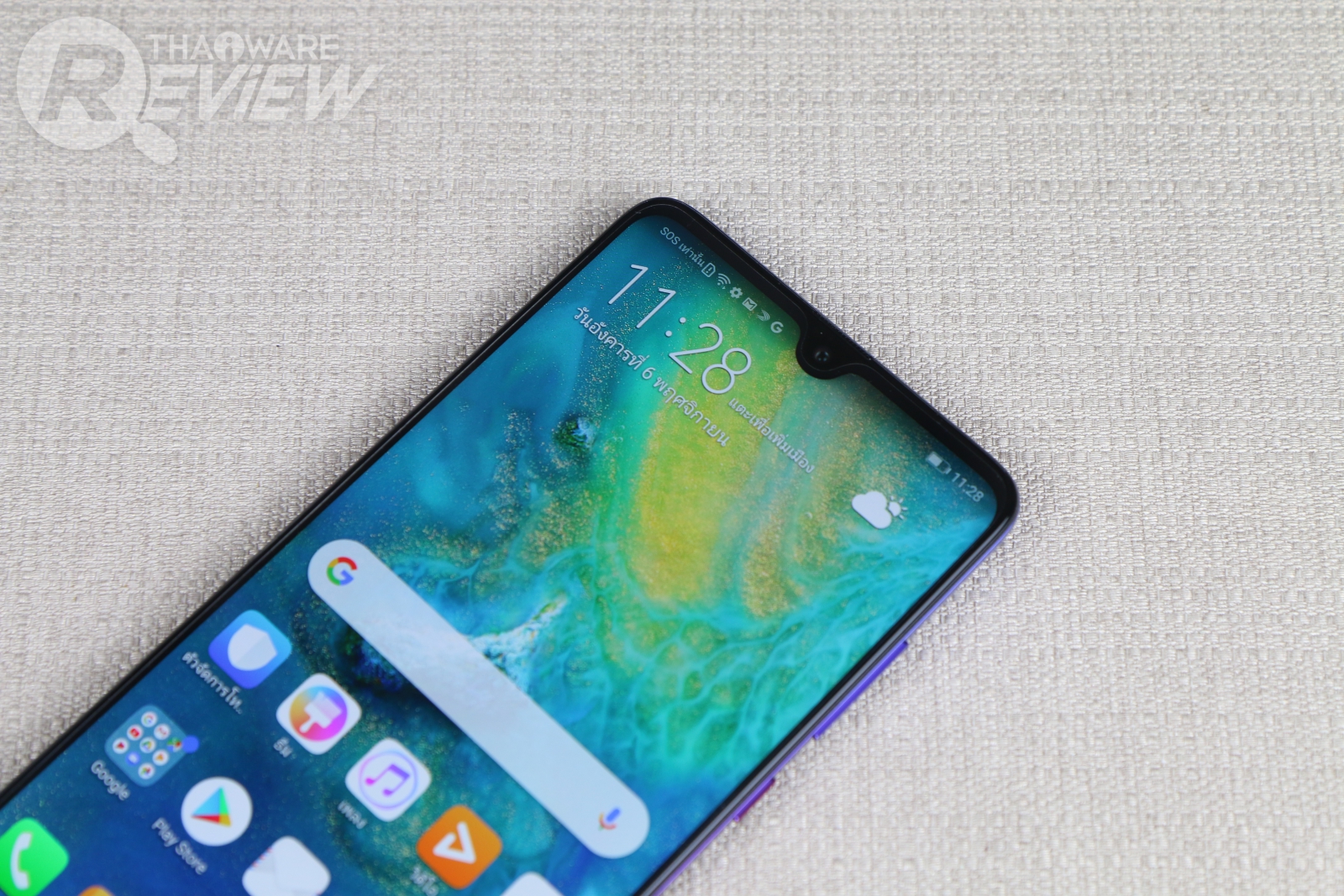 ด้านบนของหน้าจอ มี Notch ทรงหยดน้ำที่เพิ่มพื้นที่ให้กับไอคอนแจ้งเตือนได้แสดงมากขึ้นกว่ารุ่น P20 และ Mate 20 Pro ที่ใช้ Notch เป็นรอยบากสี่เหลี่ยม