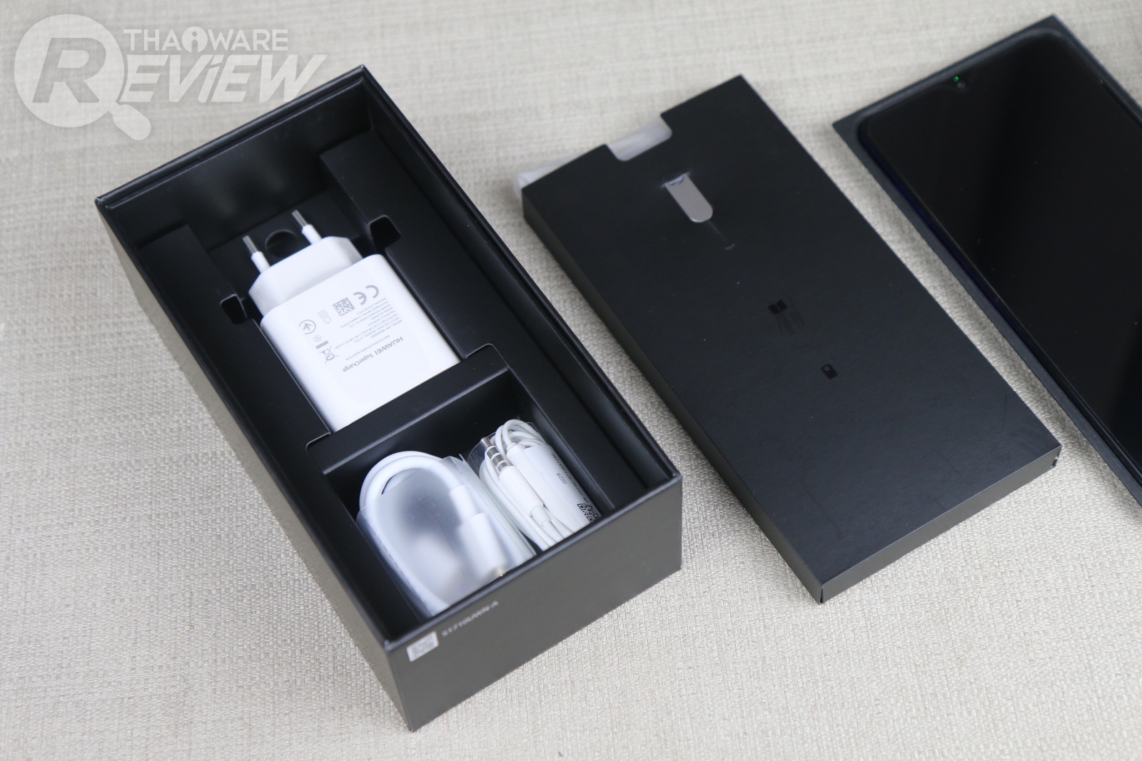 เปิดมา ก็จะมีอุปกรณเสริมต่างๆ เป็นชั้นๆ กล่องตรงกลางเป็นกล่องบรรจุเคสใสและเข็มจิ้มถาดซิม ส่วนชั้นล่างสุดประกอบไปด้วยอะแดปเตอร์ชาร์จไฟ, สาย USB-C และ หูฟังสมอลทอล์คแบบอินเอียร์