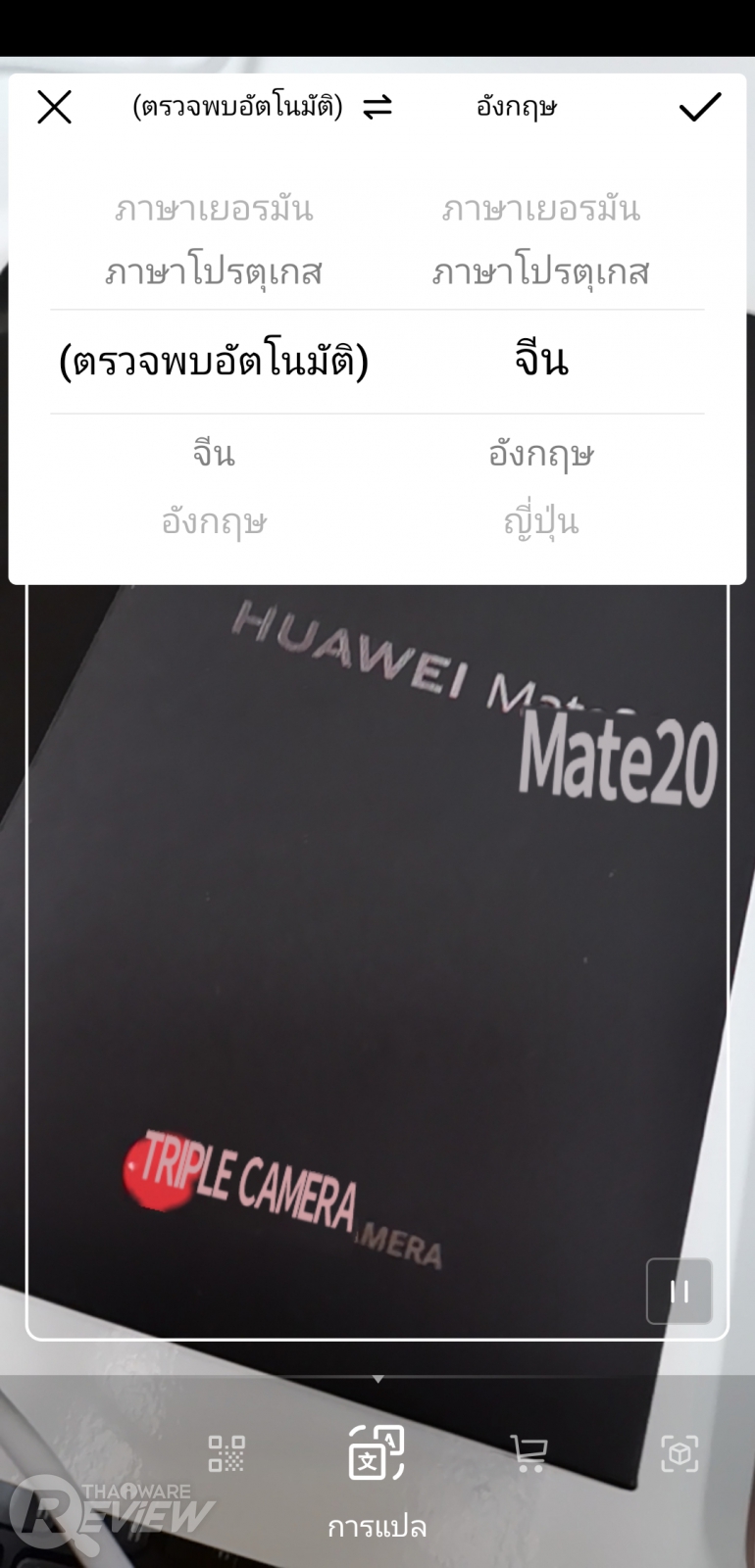 สำหรับการแปลภาษาผ่านกล้อง จะมีภาษาให้เลือกใช้งาน 10 ภาษาด้วยกัน และไม่มีภาษาไทยให้ใช้งานนะครับ อันนี้เราลองเลือกให้กล้องจับภาษาอัตโนมัติแล้วแปลภาษาไทยเป็นภาษาอังกฤษดู ผลปรากฏว่า กล้องไม่ได้มองว่าฟอนต์ไทยเป็นภาษาไทย แปลออกมาเละเลย เท่ากับว่า ถ้าจะใช้งานฟีเจอร์นี้ ต้องครอบคลุม 10 ภาษาที่มีไปก่อน