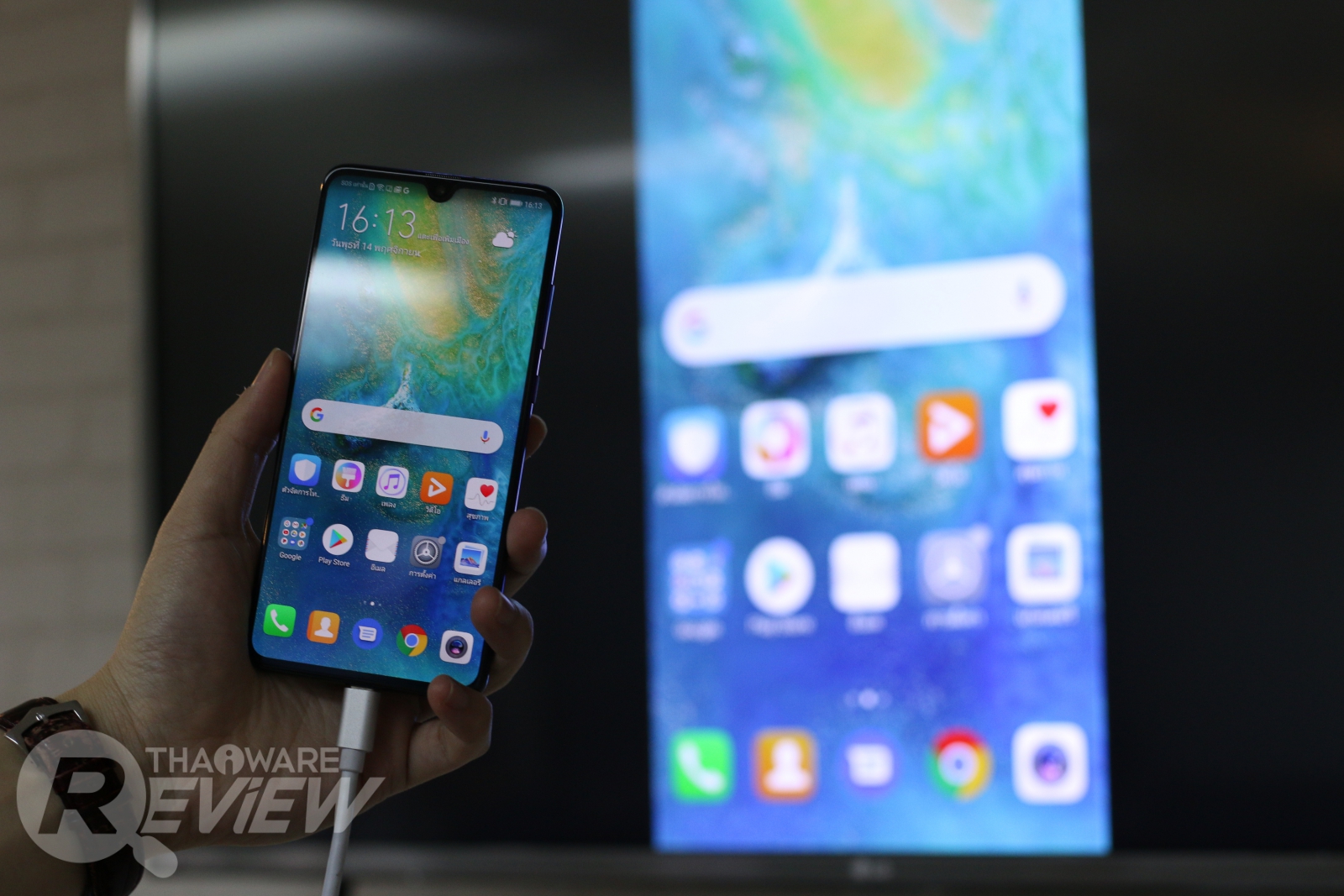 เป็นฟังก์ชั่นเหมือนกับรุ่นก่อนหน้า สำหรับ Huawei Mate 20 ที่สามารถต่อสาย HDMI เข้ากับจอขนาดใหญ่ได้ เพื่อใช้งานเป็นการแสดงผลมือถือบนจอขนาดใหญ่ได้ (Screen Mirroring) หรือจะใช้งาน Desktop mode ก็ได้เช่นกัน แต่ว่าในกล่องไม่มีสายแปลง USB-C เป็น HDMI มาให้นะครับ ต้องซื้อเสริมเอา