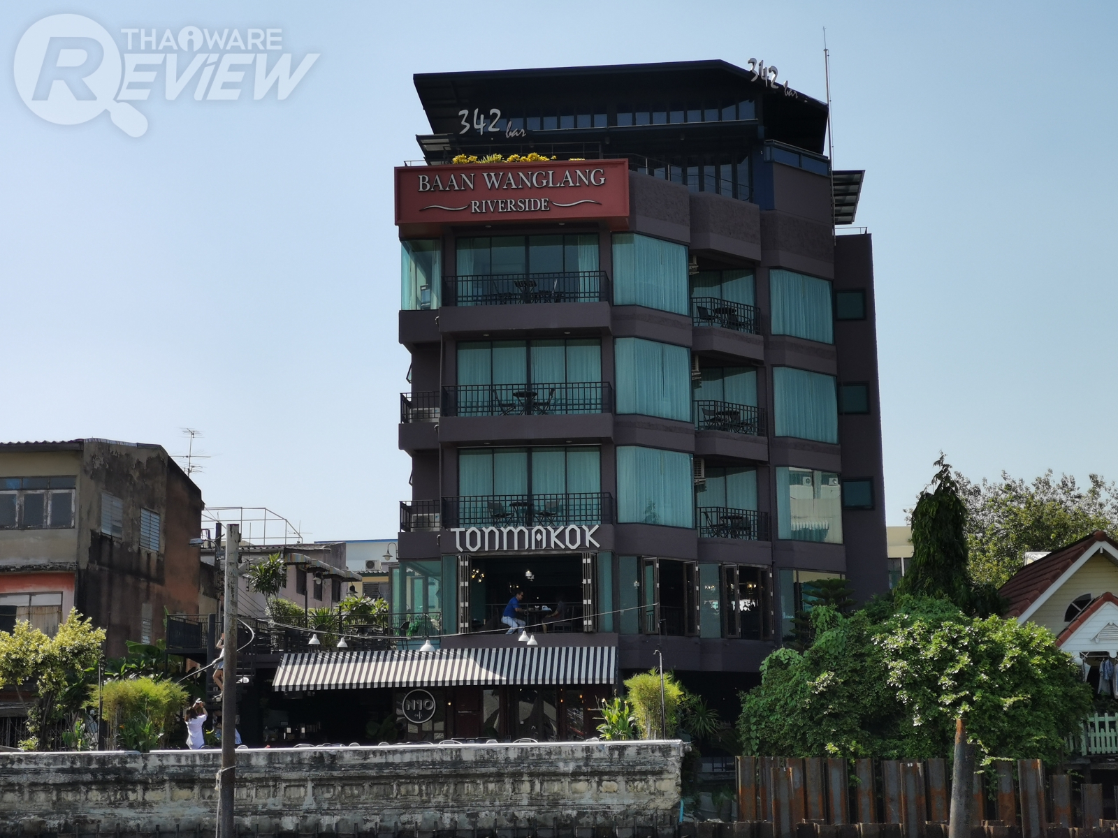 ซูมถ่ายรูปจากเรือข้ามฟากมายังตึกริมน้ำ เห็นตัวอักษรบนตึกอย่างชัดเจน