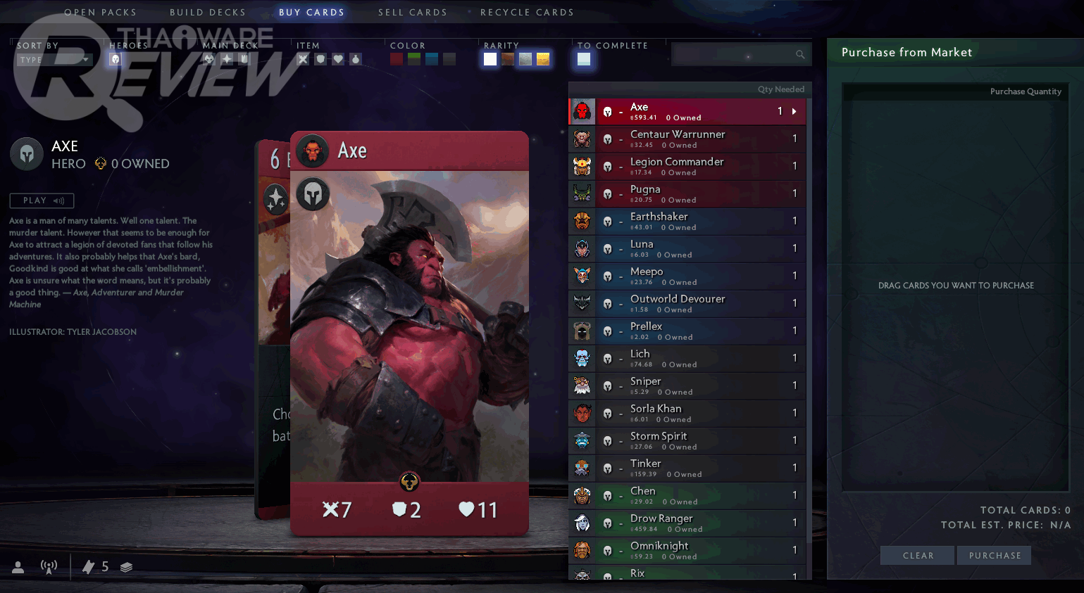 ก่อนอื่น เราจะพูดเรื่องความคุ้มค่าของเกมส์นี้ก่อน Artifact มีราคาอยู่ที่ 679 บาท ในราคานี้ เราได้การ์ดมาเปิดฟรีด้วย 10 ซอง ซึ่งมูลค่าของมันอยู่ที่ 660 บาท แล้วนะ แล้วเรายังได้ตั๋ว Event Ticket ที่ใช้สำหรับการเล่นในโหมด Expert Play มาอีก 5 ใบ ซึ่งเจ้าตั๋วนี้มีราคาอยู่ที่เกือบๆ $5 (ประมาณ 165 บาท) อันที่จริงยังมีแถม Dota Plus ให้เดือนนึง (135 บาท) ด้วย แต่ขอไม่พูดถึงละกัน เพราะมันคนละเกมส์