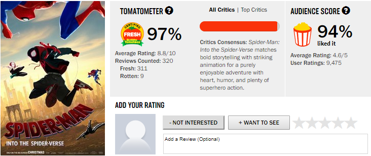 Spider-Man: Into the Spider-Verse กลายเป็นหนังที่ได้คะแนนสูงที่สุดในบรรดาหนังที่มีชื่อ Spider-Man ไปซะแล้ว โดยวัดจากเว็บ Rotten Tomatoes (97%) และ IMDb (8.7/10) แถมล่าสุดยังคว้ารางวัลแอนิเมชันยอดเยี่ยมจากเวทีลูกโลกทองคำ หรือ Golden Globe Awards ครั้งที่ 76 อีกต่างหาก