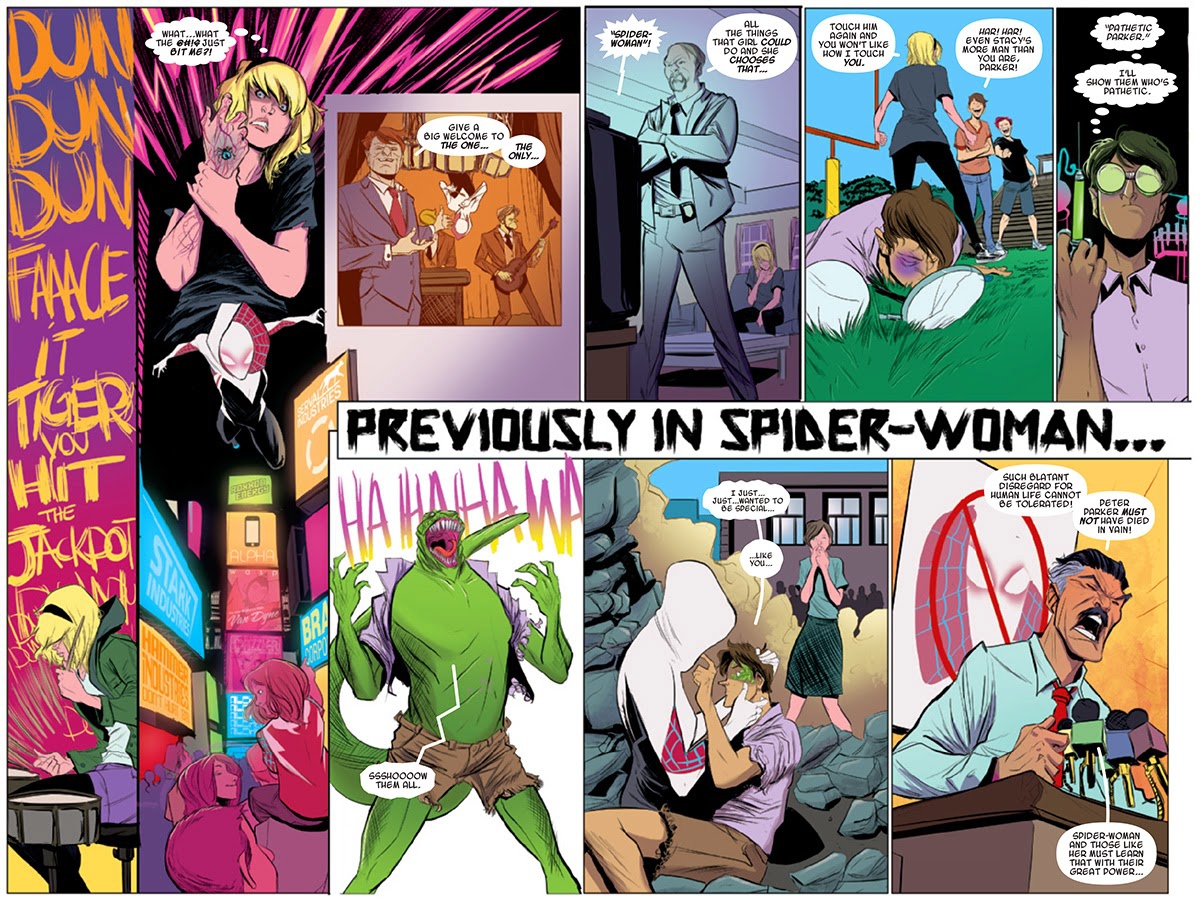 ในจักรวาลหลัก Gwen Stacy เสียชีวิต แต่ในจักรวาลนี้คนที่เสียชีวิตคือ Peter Parker แทน และที่สำคัญ Peter ตายด้วยน้ำมือ Gwen เสียเอง! โดย Peter อยากมีพลังวิเศษจึงผลิตยาขึ้นมาฉีดตัวเองให้กลายเป็นกิ้งก่า แต่ดันเกิดผิดพลาด จนทำให้ Spider-Gwen ต้องมาหยุดเขา แต่เธอก็ไม่ยั้ง ก่อนที่กิ้งก่านั้นจะกลับคืนร่าง มันก็สายไปแล้ว เพราะ Peter Parker ตายแล้ว ชีวิตฮีโร่นี่ต้องสูญเสียสินะ