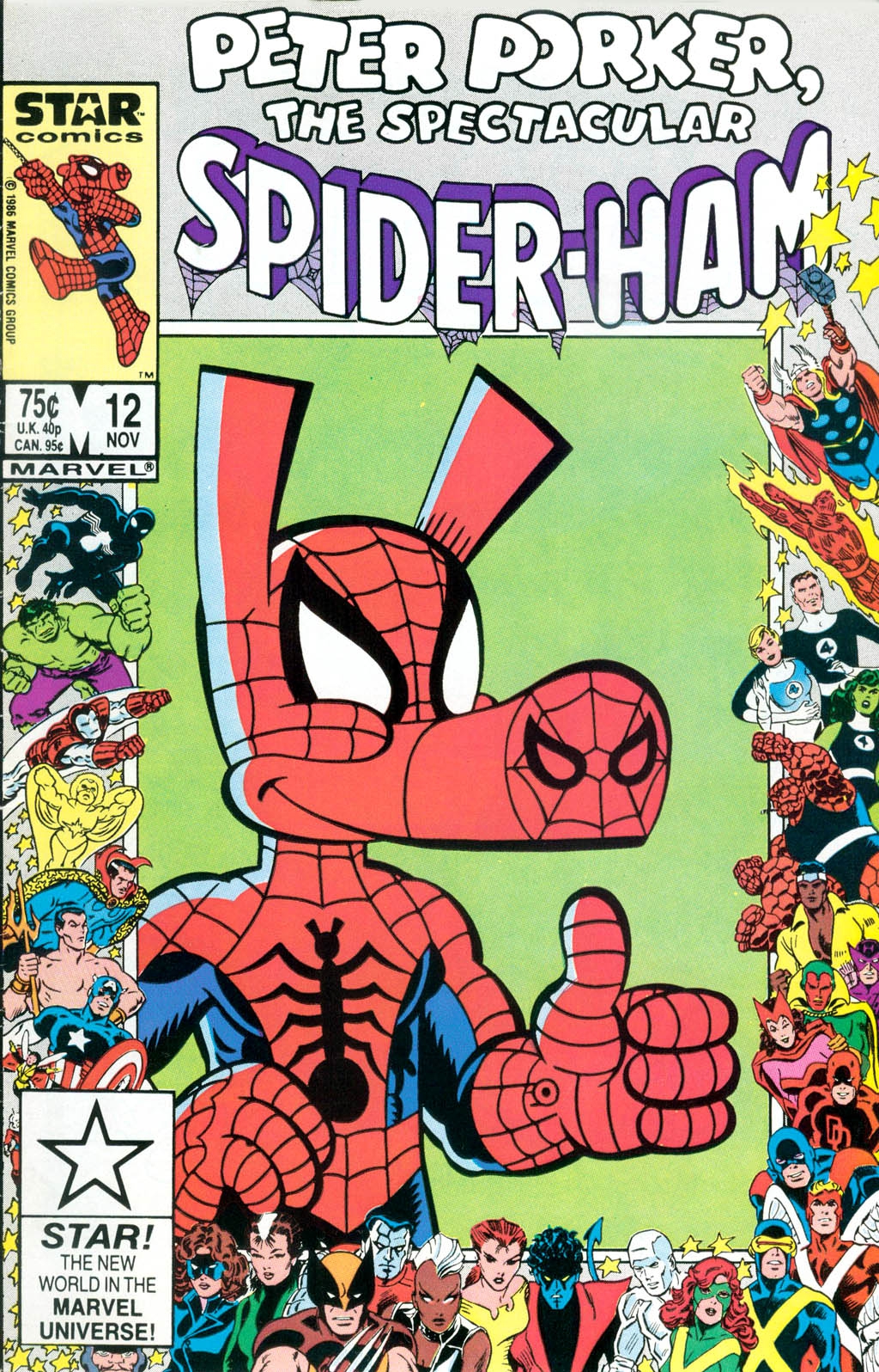 Spider-Ham หรือ Peter Porker เป็นแมงมุมมาตั้งแต่กำเนิด เขาอาศัยอยู่ในห้องใต้ดิน ซึ่งเป็นห้องแลปของนักวิทยาศาสตร์นามว่า May Poker โดยเธอกำลังประดิษฐ์เครื่องเป่าผมพลังอะตอมเครื่องแรกของโลกอยู่ แต่เมื่อเธอทดลองเครื่องก็เกิดข้อผิดพลาดขึ้น ทำให้ร่างของเธอปนรังสี ด้วยเหตุนั้นเธอจึงเดินโซซัดโซเซไปหยิบแมงมุม Peter มากัดเข้าอย่างจัง ทำให้แมงมุมตัวนี้กลายเป็นหมู เขาจึงหนีออกจากบ้านด้วยความตื่นตระหนก และค้นพบว่าตัวเองมีพลังแมงมุมอยู่ในร่างของหมู เขาจึงกลับมาที่บ้านและปลุกป้าเมย์ให้ตื่นขึ้น แต่หลังจากป้าเมย์ตื่นขึ้น คงจะได้รับการกระทบกระเทือนบางอย่าง เพราะเขาคิดว่านี่คือหลานชายสุดที่รักของเขา Peter จึงใช้ความสามารถของเขาช่วยเหลือผู้คนนับตั้งแต่นั้นมา