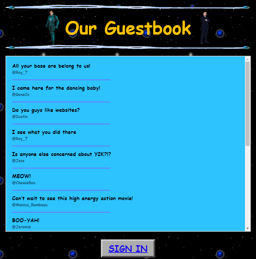 ในส่วนของล่างของเว็บจะมี ส่วน "Our Guestbook" อยู่ ซึ่งเอาไว้ให้คนเข้ามาเขียนทักทายกันได้ (ทำเอาไว้หลอกๆ จริงๆ เรา Sign In เข้าไปเขียนไม่ได้หรอกนะ) ประโยคแรกที่อยู่บนสุดของกล่องข้อความนี้ก็คือ "All your base are belong to us!" ซึ่งดูผ่านๆ อาจจะไม่มีอะไร แต่หารู้ไม่ว่า มันคือ meme สุดดังในอดีตมีที่มาจากวลีในเกมจากเครื่องเกมในตำนาน MegaDrive อย่าง Zero Wing ซึ่งในตอนแรกมันเป็นเกมของญี่ปุ่น ก่อนจะถูกแปลมาเป็นภาษาอังกฤษ และมันก็แปลมาได้อย่างผิดเพี้ยนจนถูกนำไปล้อกันทั่วบ้านทั่วเมืองในโลกอินเทอร์เน็ต ซึ่งบังเอิ๊ญบังเอิญ พล็อตของเกมและหนัง Captain Marvel ก็ช่างเหมือนกันซะเหลือเกิน เพราะมันเกี่ยวกับการรุกรานโลกของเหล่าเอเลี่ยน