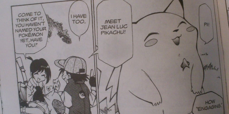 แต่ในตอนสองของหนังสือการ์ตูน The Electric Tale of Pikachu Ash กับ Misty หลังจากที่ทั้งคู่ชนะ Pewter Gym และได้ตรามา Misty ได้ถามกับ Ash ว่า นายไม่ได้ตั้งชื่อให้กับโปเกม่อนของนายหรอ เขาก็ตอบไปทันทีว่า เขาตั้งชื่อนะ ชื่อว่า “Jean-Luc Pikachu” และดูเหมือนว่า Pikachu จะจำชื่อนั้นได้เสียด้วยสิ