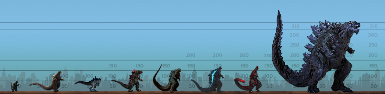 - Godzilla 2019 (MonsterVerse) เนื่องจากอยู่มาสักพักก็ต้องสูงขึ้นเป็นธรรมดา เพราะมันสูง 119.8 เมตร หนัก 99,634 ตัน