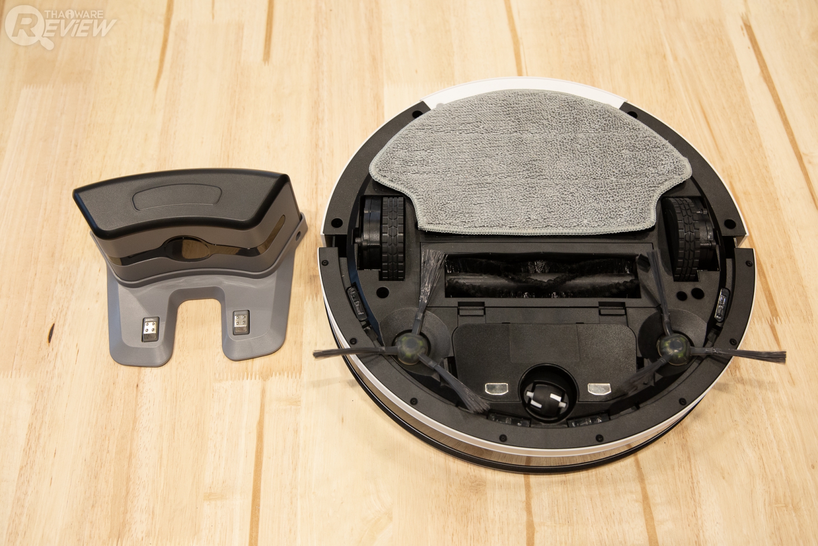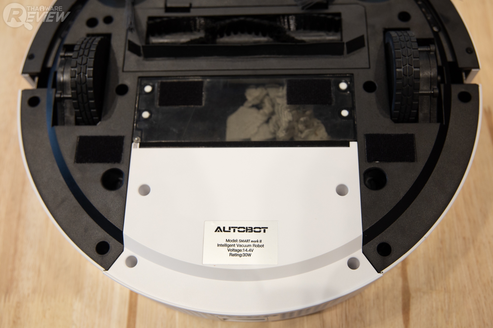 ด้านใต้เครื่อง AUTOBOT Smart Mark II แบ่งออกเป็น 3 ส่วนด้วยกัน ส่วนหน้าเป็นระบบดูดฝุ่น ประกอบไปด้วยแปรงกวาดฝุ่นซ้ายและขวา มีล้อเล็กๆ และแถบขั้วชาร์จแบตฯ อยู่ทางด้านหน้าสุด และเซ็นเซอร์กันตก 4 จุด