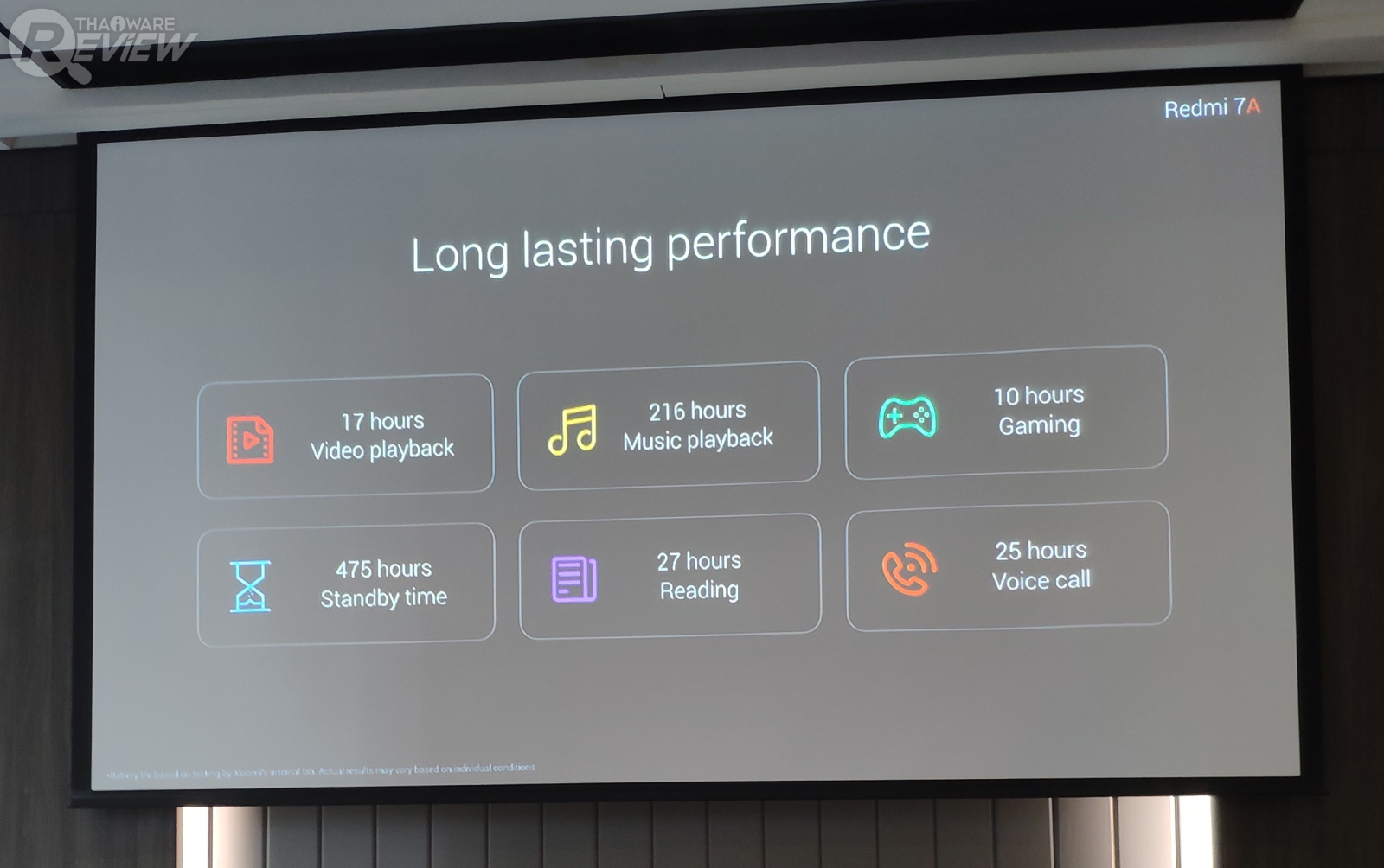 Redmi 7A ให้แบตเตอรี่มาถึง 4,000 mAh ซึ่งค่อนข้างเยอะ สำหรับสมาร์ทโฟนในระดับราคานี้ บวกกับชิปเซ็ต Snapdragon 439 ที่ช่วยจัดการเรื่องแบตเตอรี่ด้วยแล้ว ทำให้แบตฯ จุๆ ของ Redmi 7A สามารถใช้งานทั่วๆ ไปได้นานถึง 2 วัน (ถ้าเปิดสแตนบายไว้เฉยๆ อยู่ได้ถึงเกือบ 20 วัน) แต่ด้านพอร์ตใช้งานก็ยังคงให้เป็น microUSB อยู่ ตามค่าตัว