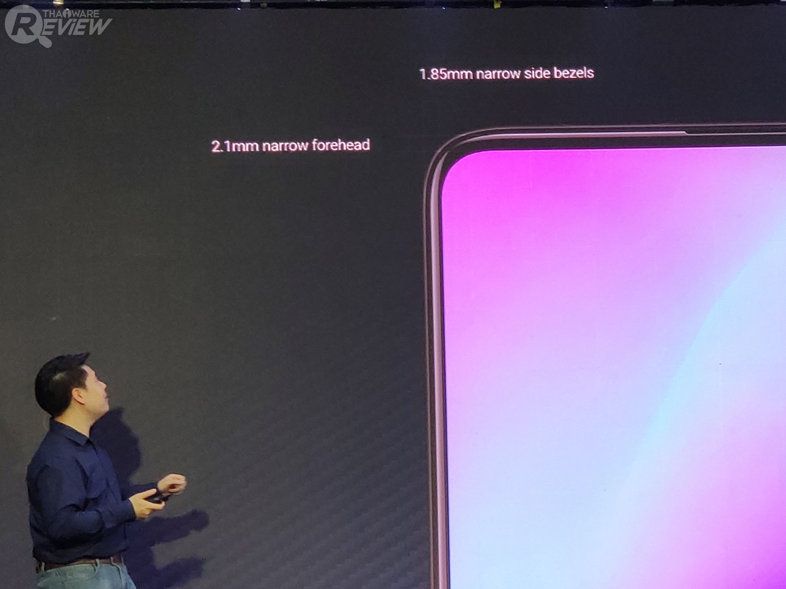 ความประทับใจคือ ขอบของหน้าจอค่อนข้างที่จะบางพอสมควรเลย ซึ่งด้านข้างอาจจะเห็นไม่ค่อยชัดเมื่อเทียบกับรุ่นอื่นในตลาด แต่คางมือถือด้านล่างก็เรียกว่าแคบจริงๆ ความหนาแค่ 3.8 มิลลิเมตรเท่านั้นเอง รวมทั้งขอบแต่ละด้านก็เป็นขอบโค้ง 2.5D ด้วย ช่วยให้ดูขอบแคบลงไปอีก ส่วนเซ็นเซอร์ต่างๆ ก็ถูกซ่อนไว้อยู่ใต้หน้าจอทั้งหมด รวมทั้งมีเซ็นเซอร์สแกนนิ้วใต้หน้าจอให้ใช้งานด้วย