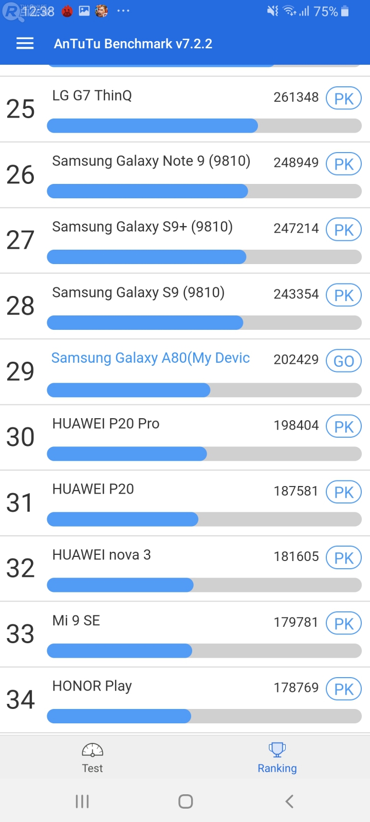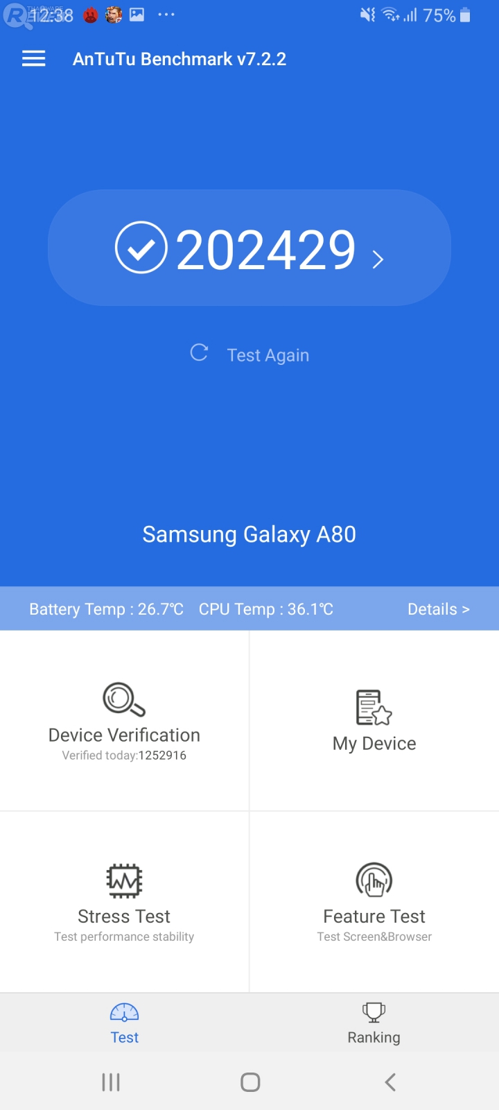 Galaxy A80 + Snapdragon 730 ทำคะแนนทดสอบจาก AunTuTu Benchmark ไปได้ถึง 202,429 คะแนน ถ้าหากจัดอันดับสมาร์ทโฟนทั้งโลกมันอยู่อันดับที่ 29 (8-8-62)