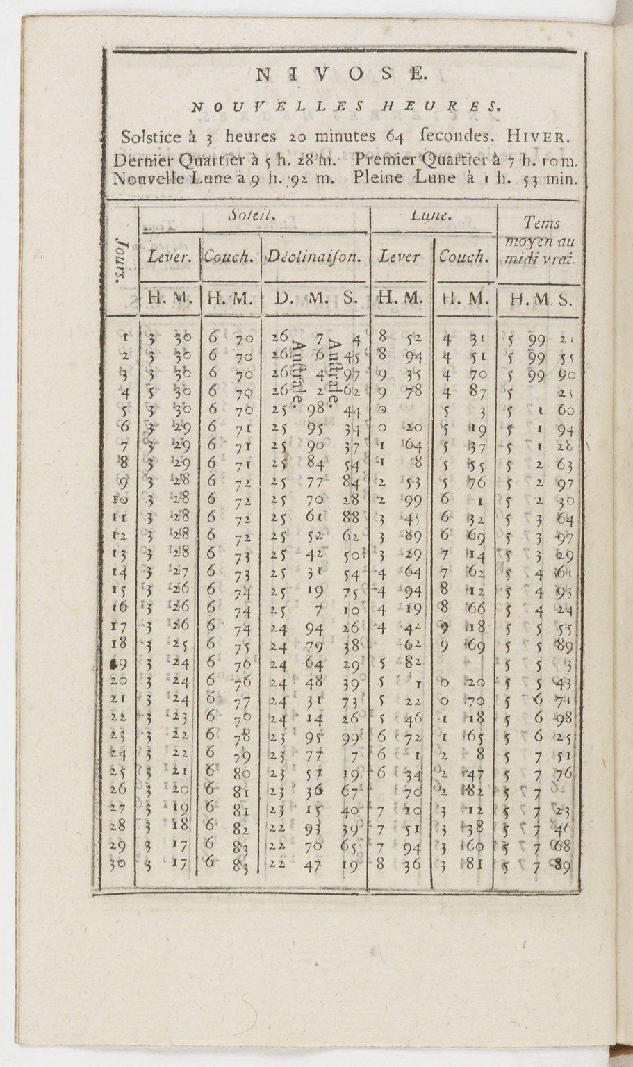 ระบบ French Revolutionary Time นี้จะแบ่งเวลาในหนึ่งวันเป็น 10 ชั่วโมง โดยหนึ่งชั่วโมงมี 100 นาที และหนึ่งนาทีมี 100 วินาที นาฬิกาที่ถูกผลิตขึ้นในช่วงนั้นก็จะมีหน้าปัดที่บอกเวลาแบบ 10 ชั่วโมง