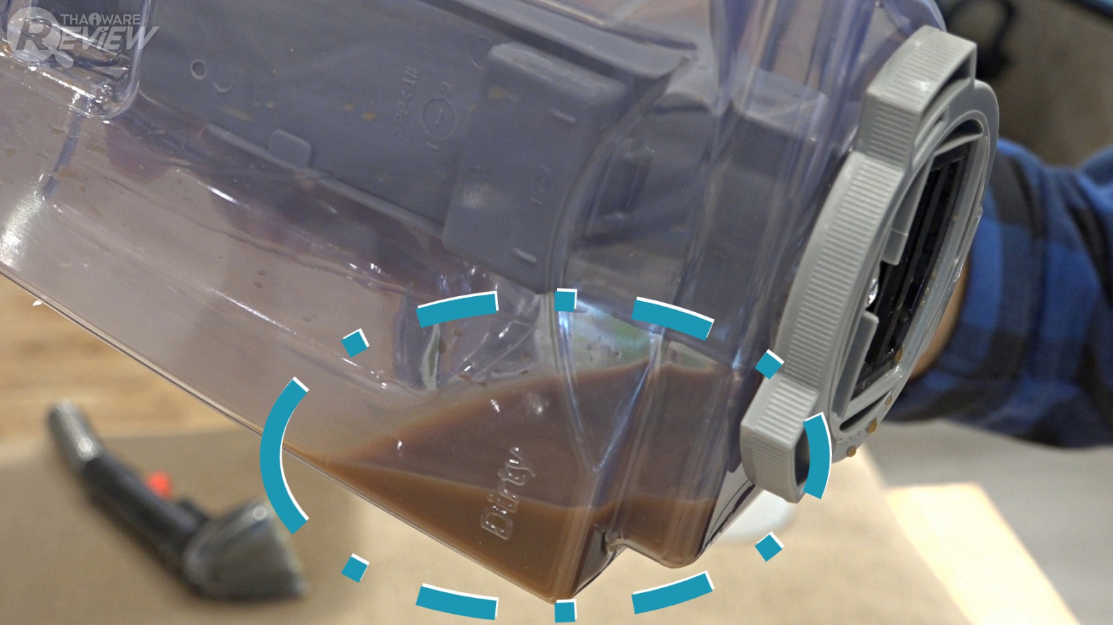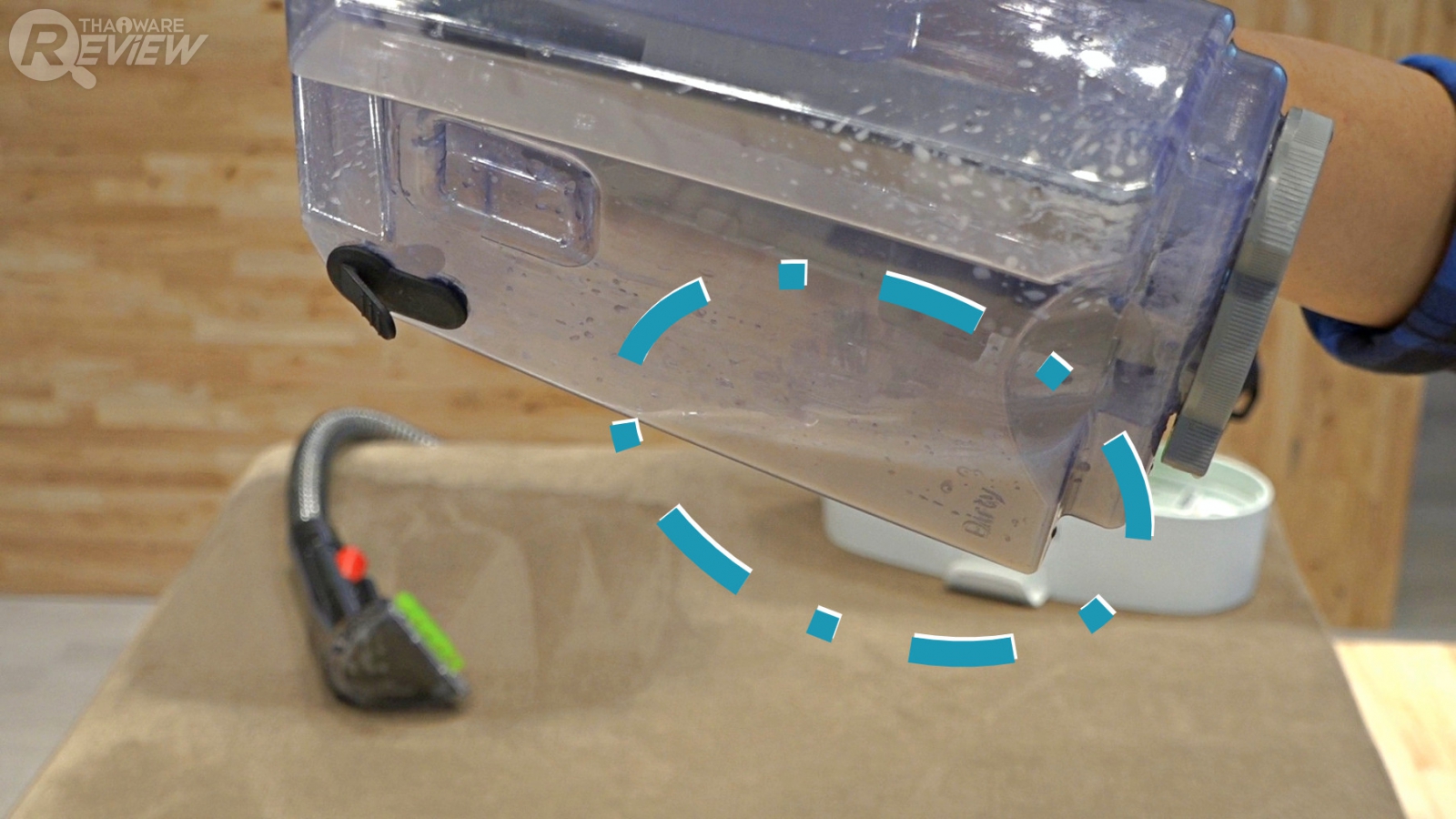 เมื่อดูดทำความสะอาดเสร็จแล้ว ก็สามารถถอดถังเก็บน้ำทิ้ง (ลูกศรชี้) ออกไปเททิ้งล้างน้ำทำความสะอาดได้