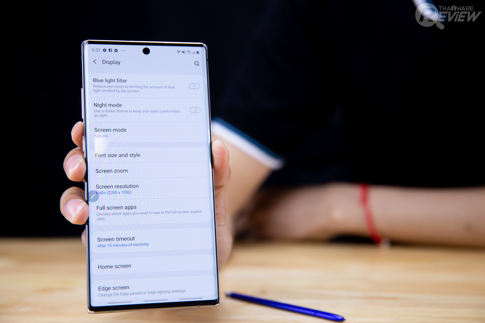 จอที่ทำออกมาใน Note10+ เป็นเทคโนโลยี AMOLED ขนาด 6.8 นิ้ว รองรับ HDR10+ สีสันสดใส เฉดสีกว้างและลึก ดีไซน์จอเป็นแบบ Infinity – O Display ไร้ขอบดูได้เต็มจอไม่สะดุดตาจริง ถือว่าเกะกะน้อยกว่ามือถือแบบมี Notch (ติ่ง) รุ่นแรกๆ ส่วนพื้นที่จอมีมากขึ้น แต่ก็มีนิ้วเผลอไปโดนขอบบ้างระหว่างจับ เพราะว่ามันบางเกินไป