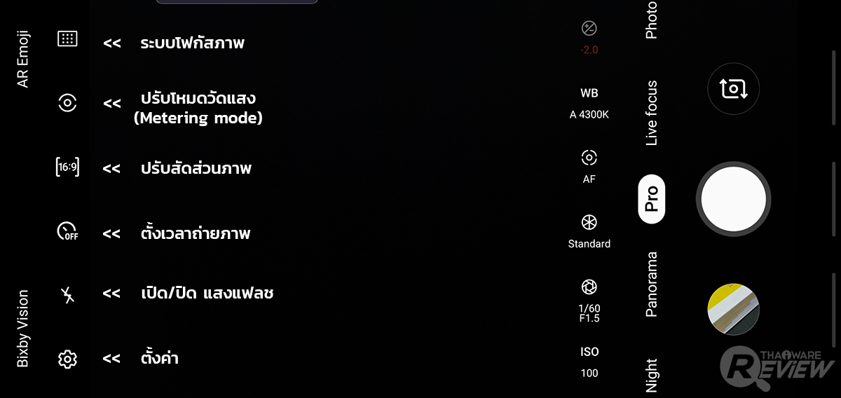 โหมดนี้เป็น โหมดสำหรับถ่ายภาพแบบปรับตั้งค่าเอง (Manual) ที่สามารถบันทึกไฟล์ภาพดิบ (Raw) จากกล้อง Note10+ ได้ โดยการตั้งค่าต่างๆ ก็จะสามารถปรับได้ตามด้านล่างนี้