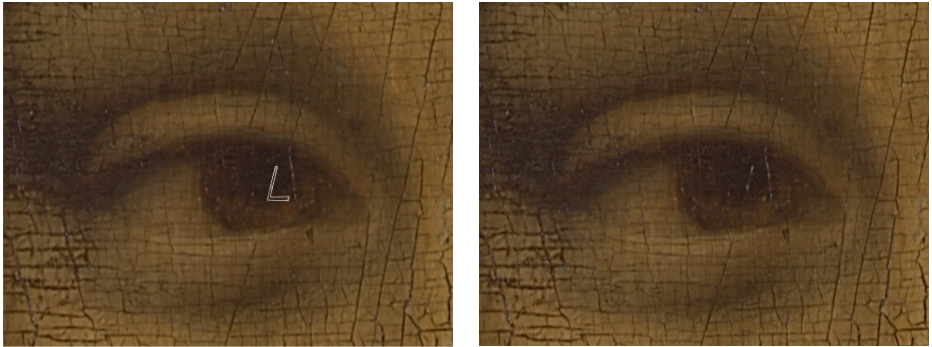 ที่ดวงตาข้างซ้ายของโมนาลิซา มีตัวอักษรอยู่ด้วยเช่นกัน แต่มันไม่ชัดเจนว่าเป็นตัว B, S, C หรือ E กันแน่ ซึ่งมันอาจจะเป็นกุญแจไปสู่ความจริงว่าใครที่เป็นเจ้าของรอยยิ้มนี้ก็เป็นได้