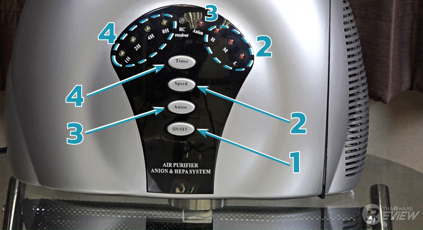 การใช้งานเครื่องฟอกอากาศตัวนี้ก็ไม่มีอะไรยุ่งยากครับ แค่เพียงยกตัวเครื่องไปตั้งวางในห้องที่ต้องการใช้งาน จากนั้นก็เสียบปลั๊กแล้วสั่งงานผ่านปุ่มกดที่อยู่ทางด้านหน้าของตัวเครื่อง โดยที่แต่ละปุ่มมีหน้าที่ดังนี้