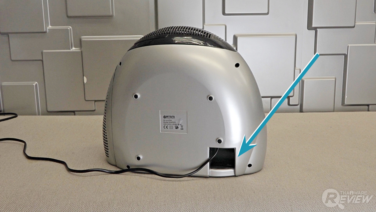 ด้านหลังตัวเครื่องมีช่องทรงสีเหลี่ยมขนาดเล็ก ที่เราสามารถม้วนสายไฟยัดเก็บไว้ในช่องนี้ได้ เพื่อไม่ให้เกะกะสายไฟในขณะที่ไม่ได้ใช้งาน และการเก็บสายไฟไว้ในตัวเครื่อง ยังทำให้สะดวกสำหรับการขนย้ายตัวเครื่องไปใช้งานในห้องอื่นๆ ของบ้าน หรือขนย้ายไปใช้งานระหว่างบ้านกับที่ทำงานด้วย