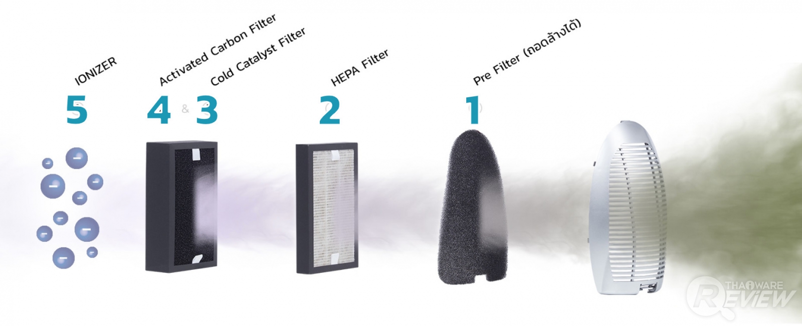 ถึงแม้จะเป็นเครื่องฟอกอากาศราคาย่อมเยา แต่มีระบบฟอกอากาศถึง 5 ขั้นตอน โดยมีรายละเอียดดังนี้