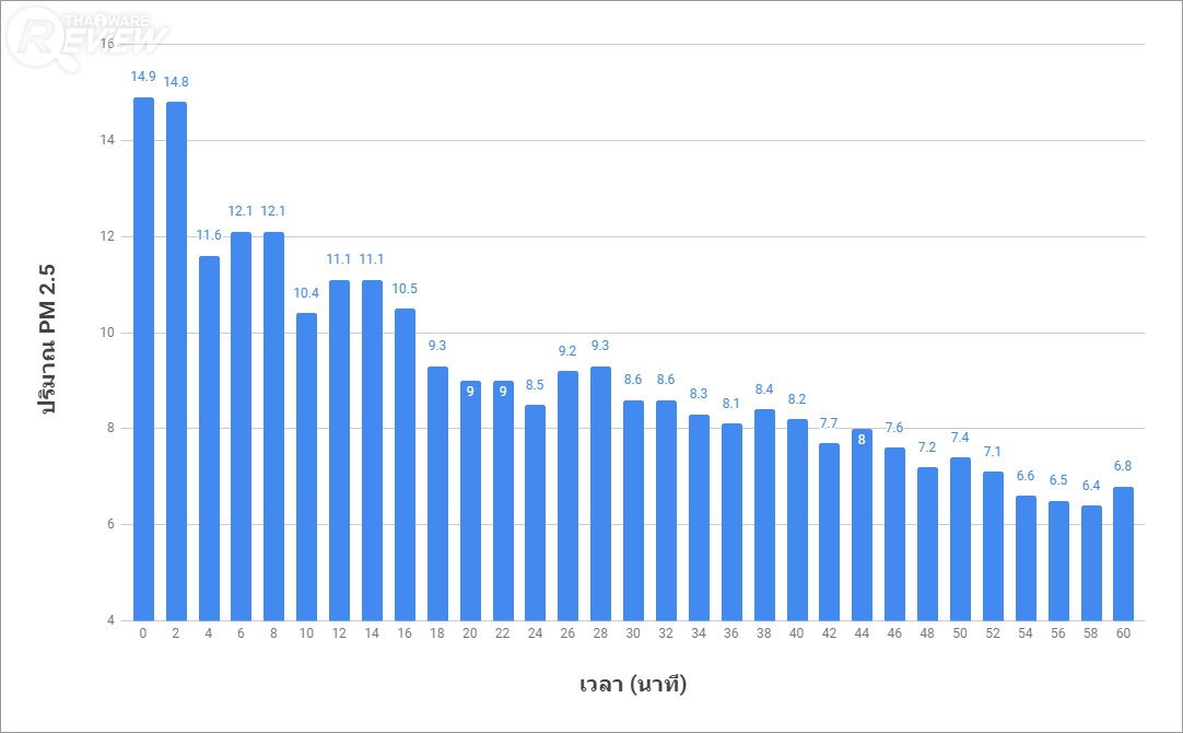 ผลก็ออกมาตามกราฟด้านบนนี้ครับ โดยเมื่อเราสั่งเปิดการทำงานของเครื่องฟอกอากาศ บนหน้าจอเครื่องวัดปริมาณฝุ่น PM 2.5 ของ Xiaomi รายงานว่าปริมาณฝุ่นในห้องอยู่ที่ระดับ 14.9 และเมื่อปล่อยให้เครื่องทำงาน ระดับฝุ่นก็เริ่มลดลงเรื่อยๆ โดยเมื่อเวลาผ่านไป 30 นาที ระดับฝุ่นลดลงมาอยู่ที่ 8.6 และเมื่อเครื่องทำงานครบเวลา 60 นาที ระดับฝุ่นลดลงมาอยู่ที่ระดับประมาณ 6 กว่าๆ เรียกได้ว่าปริมาณฝุ่น PM 2.5 ลดลงมาเกินครึ่งเมื่อเทียบกับในตอนที่เริ่มเปิดเครื่องใหม่ๆ และถ้าปล่อยให้เครื่องทำงานต่อไปเรื่อยๆ ระดับฝุ่นก็มีแนวโน้มที่จะลดลงได้อีก ต้องบอกว่าประสิทธิภาพดีใช้ได้เลย