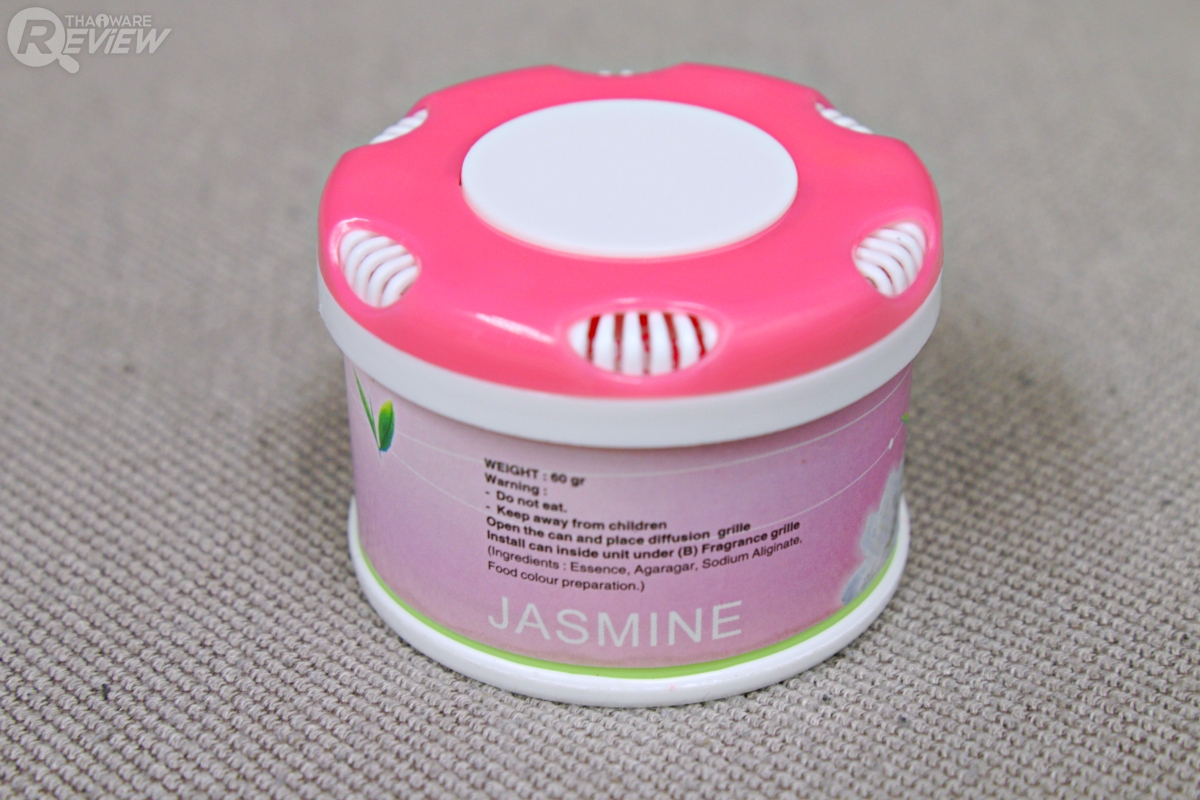 ตลับเจลน้ำหอมปรับอากาศที่แถมมาให้เป็นกลิ่น Jasmine หรือกลิ่นดอกมะลิ โดยเป็นตลับเจลทรงกลมที่มีขนาดเส้นผ่านศูนย์กลาง 6.3 ซม. และ หนา 4.8 ซม. เพราะฉะนั้นถ้ากลิ่นหอมหมด แล้วต้องการเปลี่ยนใหม่ ก็ควรหาตลับเจลที่มีขนาดใกล้เคียงกัน