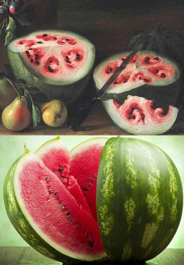รูปภาพแตงโมในสมัยก่อนจากภาพวาดของ Giovanni Stanchi ในช่วงศตวรรษที่ 17 แสดงให้เห็นว่า เมื่อหลายร้อยปีที่แล้วแตงโมไม่ได้สีแดงสดน่ารับประทานทั้งลูก แต่ภายในลูกแตงโมนั้นจะแบ่งออกเป็น 6 ชิ้นย่อยๆ คล้ายกลีบส้ม (ยักษ์) แต่เมื่อเวลาผ่านไปมนุษย์ก็ได้นำเอาแตงโมนี้มาเพาะพันธุ์และดัดแปลงไปเรื่อยๆ จนได้ออกมาเป็นแตงโมแบบในทุกวันนี้