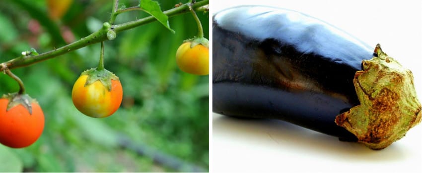 ในช่วงแรกก่อนจะมาเป็นมะเขือม่วงที่เราเห็นกันอยู่ในปัจจุบันนี้มันเคยมีรูปร่างหน้าตาคล้ายกับมะเขือเปราะที่มีลักษณะเป็นลูกกลมๆ สีขาว, เหลือง, ส้ม, ม่วง และมีหนามที่บริเวณขั้ว