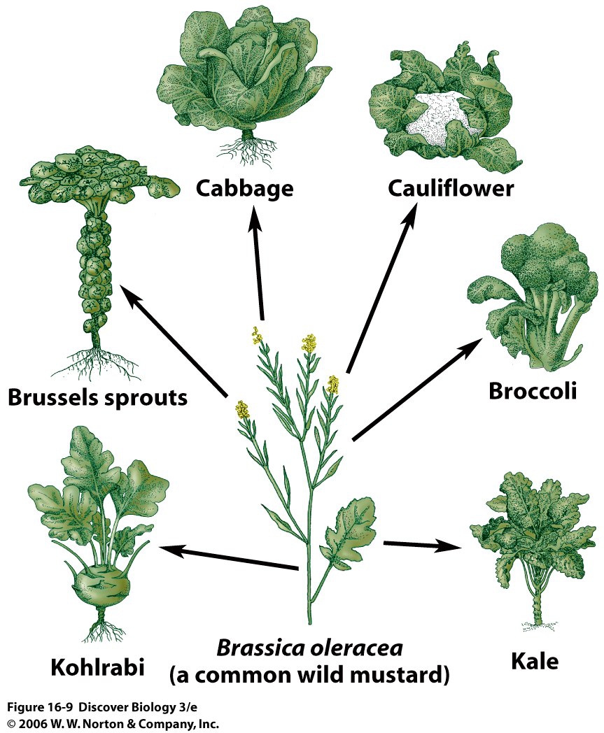 ผักในตระกูล Brassica Oleracea (ต้นมัสตาร์ดป่า) ที่ถูกคัดเลือกและปรับปรุงพันธุ์พืชจนในที่สุดก็เกิดการกลายพันธ์มาเป็นผักกะหล่ำในแบบต่างๆ ไม่ว่าจะเป็น กะหล่ำปลี, กะหล่ำดอก, กะหล่ำดาว, โคลราบิ (กะหล่ำปม) , บร็อคโคลี, คะน้า เป็นต้น