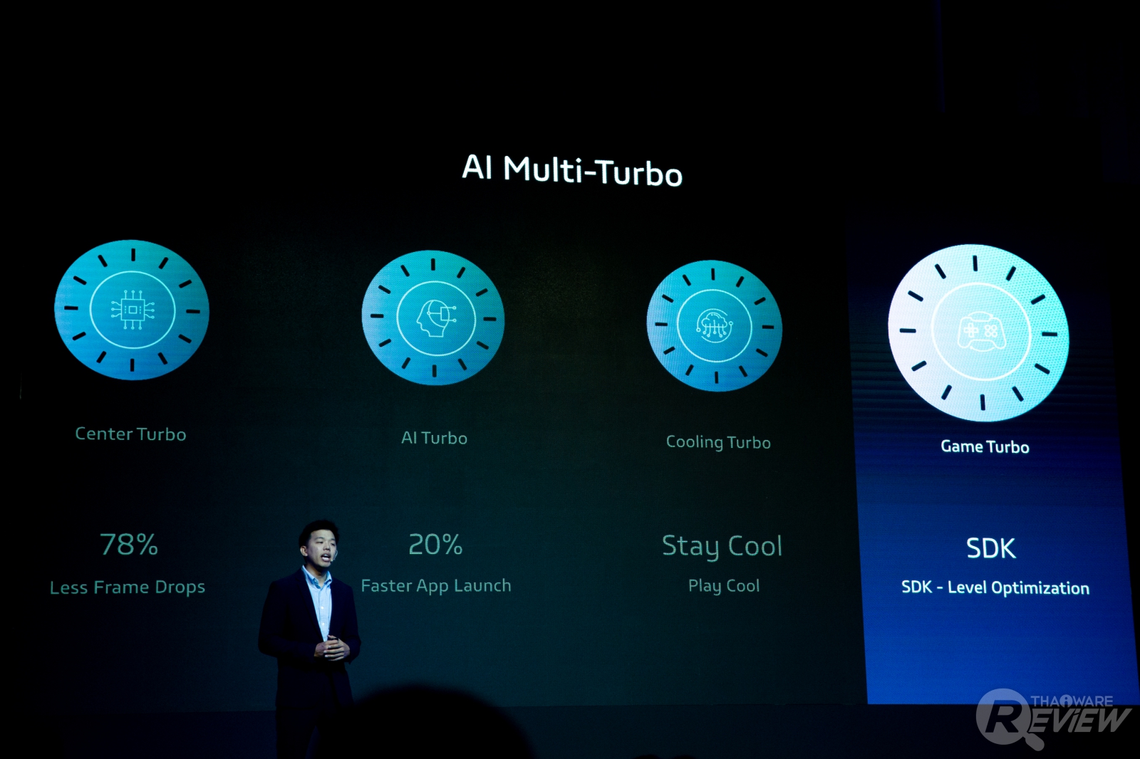 ในส่วนนี้ทาง Vivo ได้ใส่ระบบ AI เข้ามาช่วยในเรื่องการจัดการระบบเพิ่มประสิทธิภาพเครื่องให้ทำงานได้ดีมากยิ่งขึ้น ยกตัวอย่างเช่นเวลาเล่นเกมส์ AI ตัวนี้จะช่วยปรับจูนเครื่องลดอัตราการดรอปของเฟรมเรทมากขึ้นถึง 78% เปิดแอปฯ ที่ใช้งานบ่อยๆ ได้เร็วกว่าเดิมถึง 20% เล่นได้เครื่องไม่ค่อยร้อน แถมจูน SDK แบบเฉพาะให้กับระบบ ทำให้เล่นเกมส์ได้ลื่นกว่าเดิม