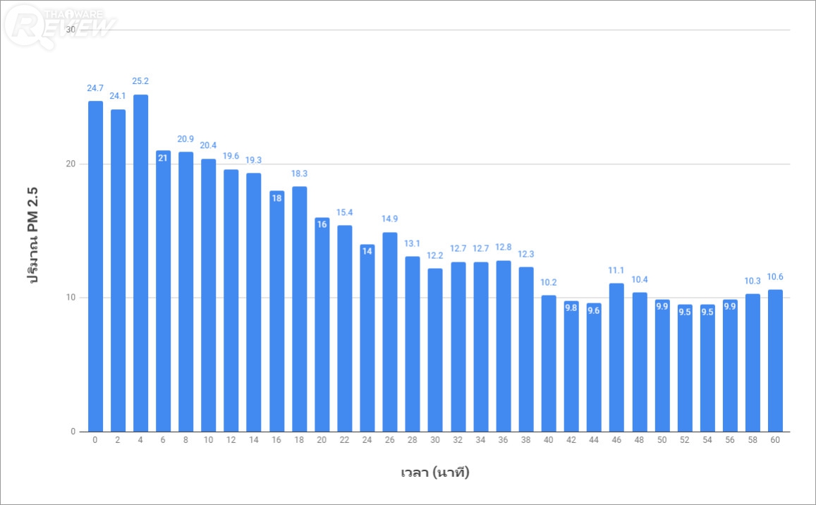 ผลก็ออกมาตามกราฟด้านบนนี้ครับ โดยเมื่อเราสั่งเปิดการทำงานของเครื่องฟอกอากาศ บนหน้าจอเครื่องวัดปริมาณฝุ่น PM 2.5 ของ Xiaomi รายงานว่าปริมาณฝุ่นในห้องอยู่ที่ระดับ 24.7 และเมื่อปล่อยให้เครื่องทำงาน ปริมาณ PM 2.5 ก็ลดลงเรื่อยๆ พอเมื่อเวลาผ่านไป 42 นาที ปริมาณฝุ่นก็ลดลงจนต่ำกว่าระดับ 10 และเมื่อปล่อยให้เครื่องทำงานไปเรื่อยๆ ระดับค่า PM 2.5 ในห้องก็สวิงตัวอยู่ในระดับ 9.5 - 11.1 ซึ่งก็เป็นระดับปริมาณฝุ่น PM 2.5 ที่ต่ำมากๆ ก็ต้องบอกว่า เจ้าเครื่องฟอกอากาศตัวนี้ สามารถรับมือกับฝุ่น PM 2.5 ได้อย่างมีประสิทธิภาพ