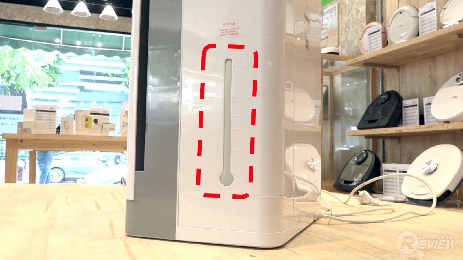 การตรวจสอบปริมาณน้ำในถัง ทำได้ผ่านขีดบอกระดับน้ำที่อยู่ทางด้านข้างถังน้ำ แต่มีข้อสังเกตคือช่องที่เจาะโปร่งเพื่อให้มองเห็นระดับน้ำนั้นมีสีที่ค่อนข้างขุ่น ทำให้ตรวจสอบระดับน้ำค่อนข้างยาก แต่ก็ยังมีเรื่องดีอยู่คือ เมื่อน้ำหมด ดวงไฟ LACK บนแผงปุ่มกดจะติดสว่าง เพื่อเตือนให้เรารู้ว่าต้องเติมน้ำได้แล้วนะ