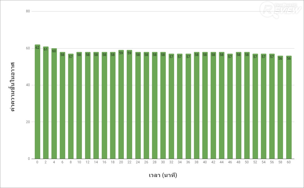 โดยตามทฤษฎีคือ ค่าความชื้นในอากาศที่ระดับ 60% ถือว่าเป็นระดับที่พอเหมาะ อากาศไม่ชื้น หรือไม่แห้งจนเกินไป เราทดสอบในห้องที่มีขนาดประมาณ 60 ตร.ม. โดยเปิดแอร์ในห้อง 2 ตัว ซึ่งตามหลักการ การเปิดแอร์ในห้องจะทำให้อากาศแห้ง ความชื้นในอากาศลดลง โดยก่อนที่จะเปิดให้เครื่องทำงาน ความชื้นในอากาศอยู่ที่ระดับเกิน 60% อยู่เล็กน้อย เมื่อเปิดให้เครื่องทำงาน ความชื้นลดลงมาต่ำกว่าระดับ 60% เล็กน้อย โดยสวิงตัวอยู่ในช่วง 56-59% ซึ่งก็เป็นระดับความชื้นที่ต่ำกว่าจุดสมดุลอยู่เล็กน้อย