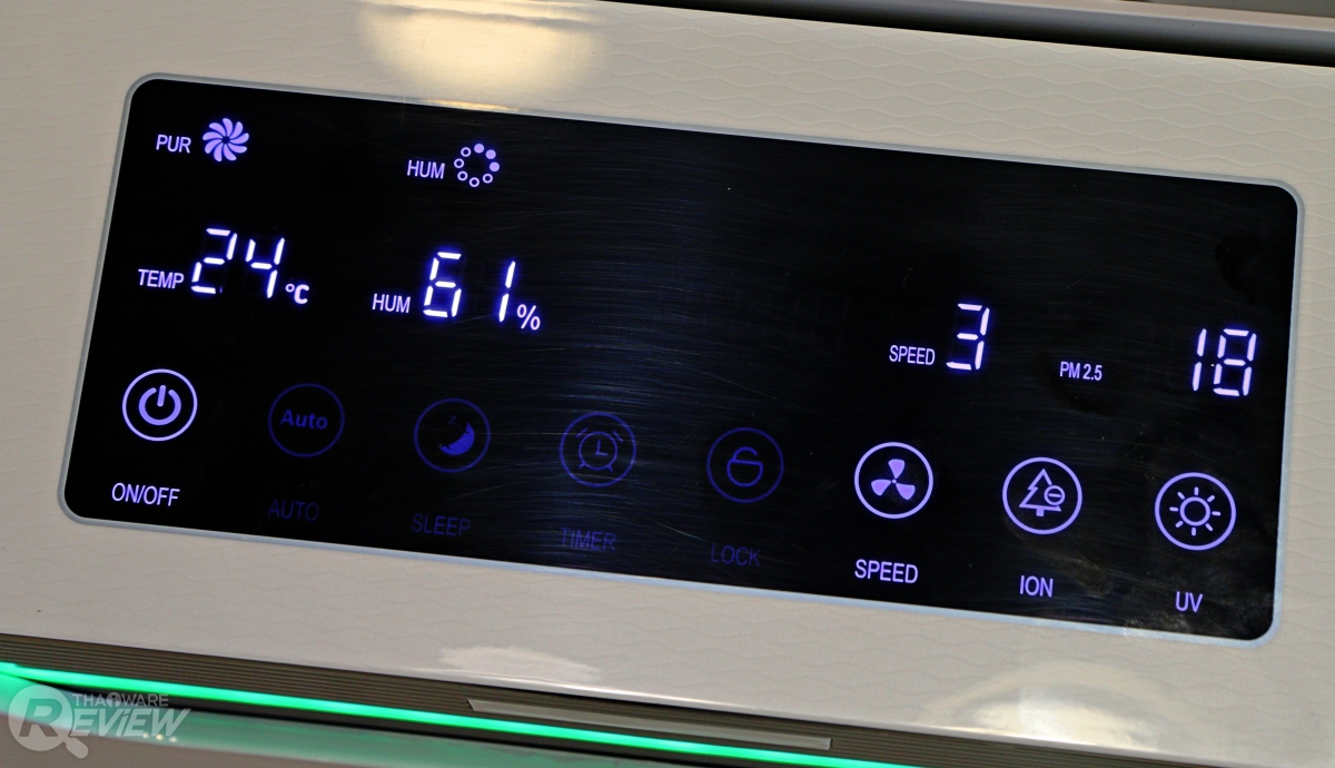 ในตัวเครื่องมีเซ็นเซอร์ตรวจวัดคุณภาพอากาศ (ปริมาณฝุ่น PM 2.5) ที่นอกจากจะแสดงระดับ PM 2.5 ผ่านตัวเลขบนแผงปุ่มกดแล้ว ก็ยังมีการแสดงระดับปริมาณฝุ่นผ่านเส้นไฟที่ตัวเครื่อง โดยที่ถ้าแสงไฟออกไปในโทนสี แดง เหลือง แสดงว่าในห้องมีฝุ่นค่อนข้างมาก (อาจจะเป็นในตอนที่เปิดเครื่องใหม่ๆ) แต่เมื่อปล่อยให้เครื่องทำงานฟอกอากาศไปสักพัก ปริมาณฝุ่นในห้องลดลง สีของแสงไฟจะเปลี่ยนมาเป็น ฟ้า หรือ เขียว โดยที่แสงสีเขียวแสดงว่าในห้องมีปริมาณฝุ่นที่น้อยมากๆ