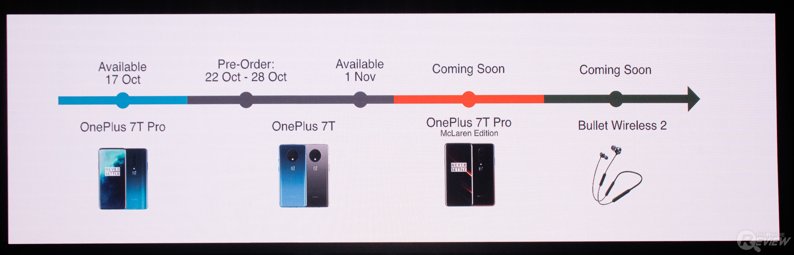 สำหรับวันวางจำหน่ายทาง OnePlus ประเทศไทยได้วางจำหน่าย OnePlus 7T Pro เป็นที่เรียบร้อย ส่วน OnePlus 7T เปิดให้จองระหว่าง 22-28 ตุลาคม และวางจำหน่ายวันที่ 1 พฤศจิกายน ส่วน 7T Pro McLaren Edition กับหูฟัง Bullet Wireless 2 คงต้องรอกันไปก่อนน่าจะเปิดตัวในเร็วๆ นี้