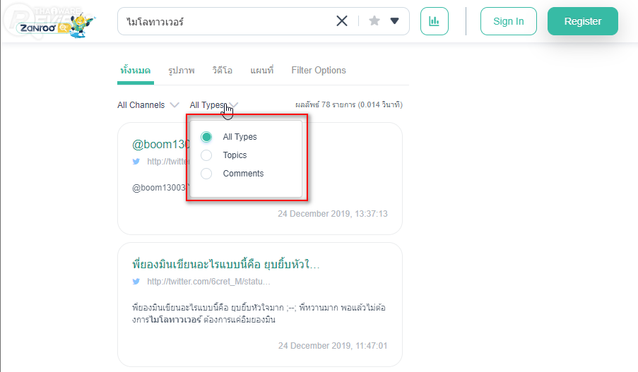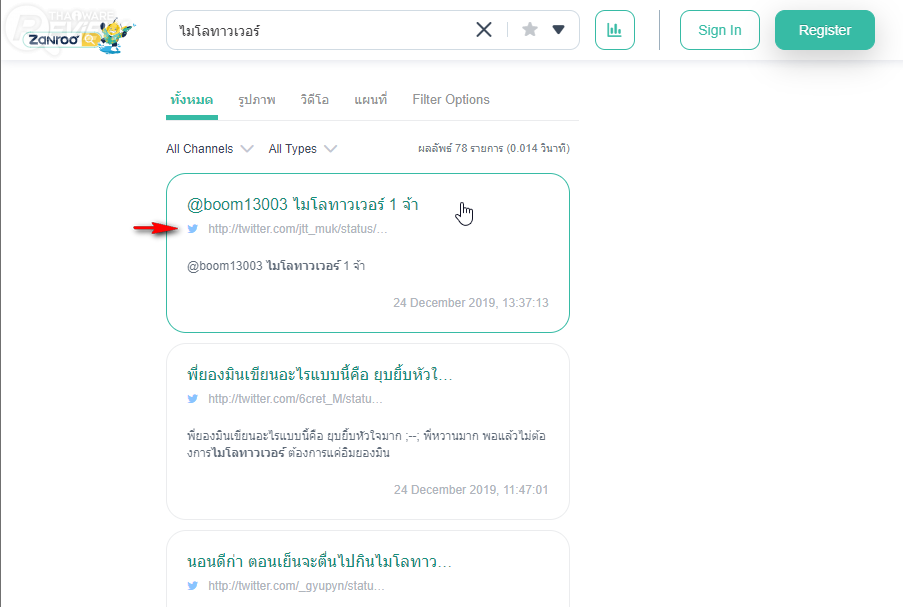 mØuanบ่อยครั้งที่การค้นหาข้อมูลบนเสิร์ชเอนจินต่างๆ (เช่น Google) ในปัจจุบัน เว็บที่ติดหน้าแรกไม่ใช่เว็บไซต์ บล็อกหรือเว็บบอร์ดที่ไหน แต่กลับกลายเป็นแพลตฟอร์มโซเชียล ไม่ว่าจะเป็นเฟซบุ๊ค ทวิตเตอร์หรือแม้กระทั่งยูทูป ซึ่งก็ต้องยอมรับจริงๆ ว่า ข้อมูลหรือคำตอบส่วนใหญ่บนโลกใบนี้ได้ย้ายไปอยู่บนโซเชียลกัน แต่ถ้าจะให้เสิร์ชเอนจินที่ใช้งานกันปกติล้วงลึกไปถึงโซเชียลก็ยังไม่มีฟีเจอร์ที่ตอบโจทย์เท่าไหร่ แต่มีเครื่องมือค้นหาอยู่ตัวหนึ่ง ที่เราสามารถล้วงลึกข้อมูลต่างๆ ในโซเชียลได้ รวมทั้งตอบโจทย์กับสายงานการตลาดดิจิทัลในปัจจุบันเป็นอย่างมาก นั่นก็คือเสิร์ชเอนจินที่ชื่อว่า Zanroo Search