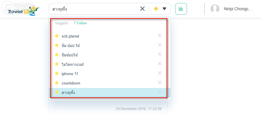 ถ้าเรามีการค้นหาคีย์เวิร์ดหนึ่งๆ เป็นประจำอยู่แล้ว เช่น การทำตลาดให้แบรนด์ หรือติดตามศิลปิน ก็สามารถติดดาว (Follow) ให้กับคีย์เวิร์ดนั้นๆ ให้สามารถเรียกใช้ง่ายๆ ได้ แต่ต้องเข้าสู่ระบบก่อน จะใช้อีเมล เฟสบุ๊ค หรือบัญชีกูเกิ้ลก็ได้ ซึ่งเมื่อตั้ง Follow แล้ว คีย์เวิร์ดนั้นก็จะถูกแสดงไว้ใต้ช่องค้นหา
