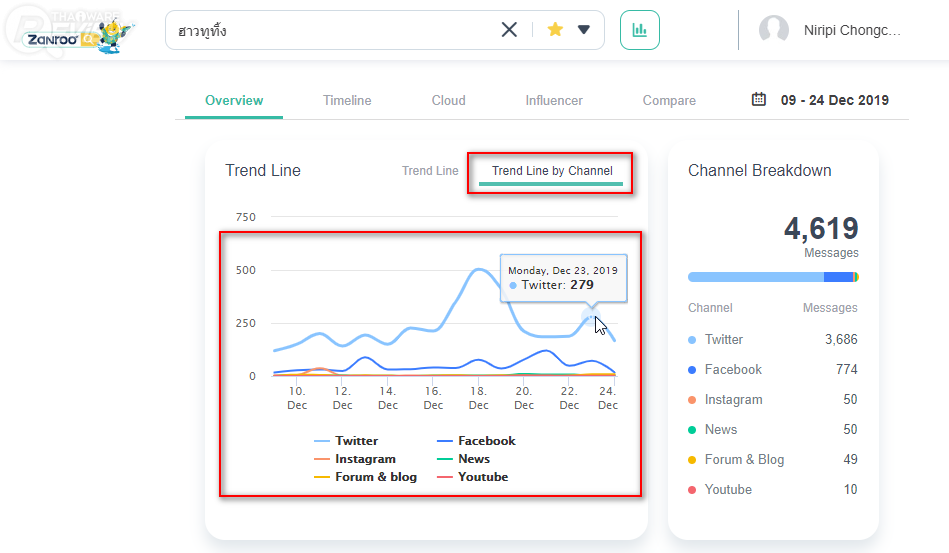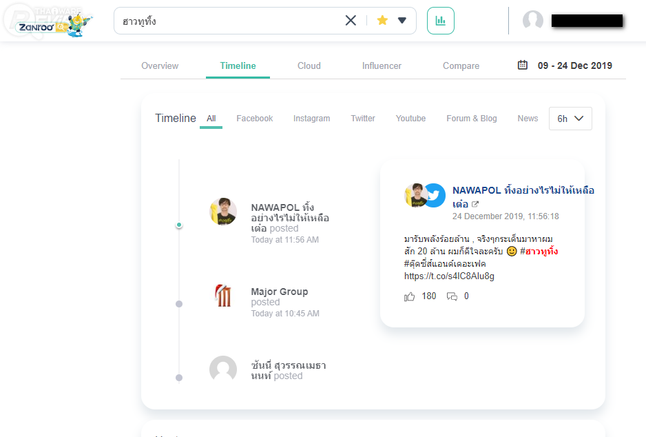 ไม่เพียงแค่ข้อมูลในเชิงปริมาณเท่านั้น เราสามารถดูช่วงเวลาการโพสต์ของข้อมูลที่เราค้นหาได้ ว่าผู้ใช้งานแต่ละท่านได้โพสต์เทรนด์ดังกล่าวในช่วงเวลาไหน ใครลำดับก่อน-หลัง เรียงให้เห็นกันชัดๆ เลย