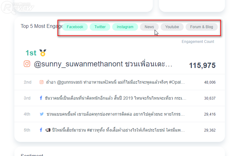ในส่วนของ Top 5 Most Engagement มีปุ่มฟิลเตอร์ให้เลือกเปิด/ปิดได้ ว่าจะดูข้อมูลอันดับในช่องทางไหนบ้าง?
