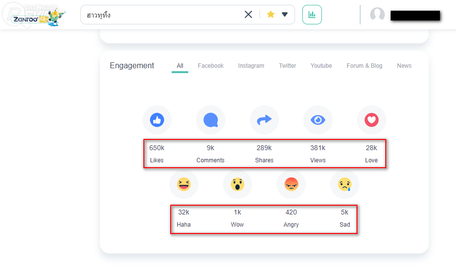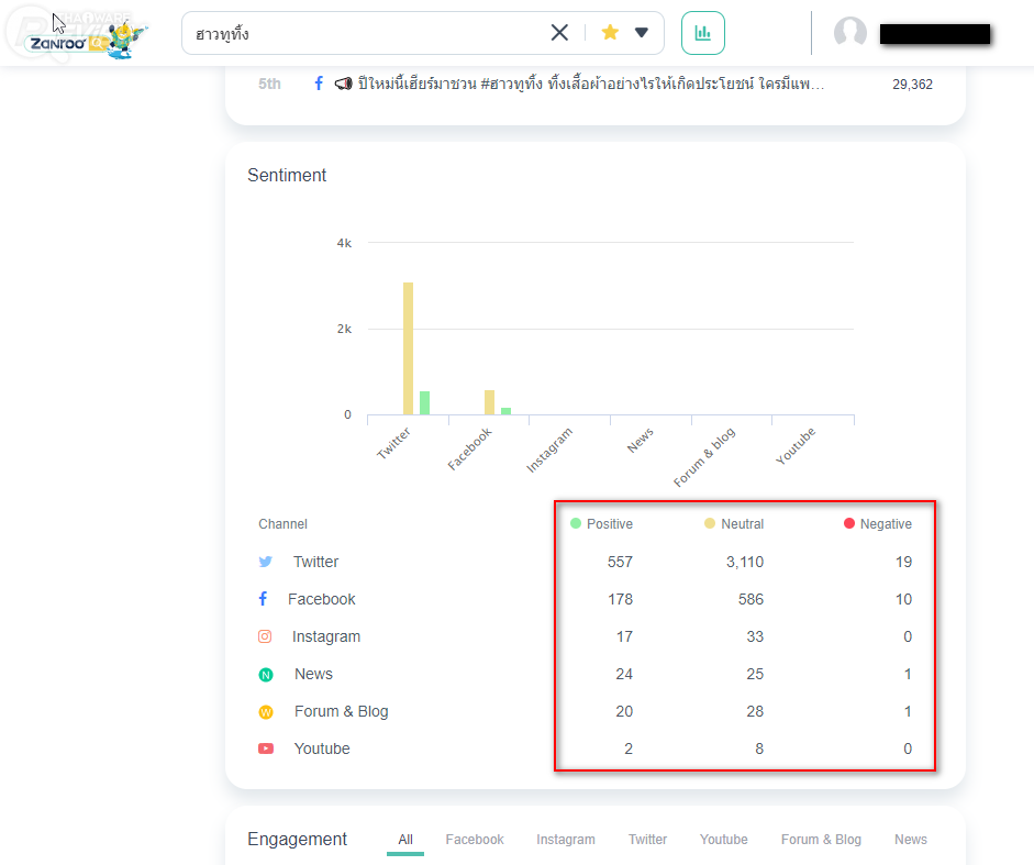 นอกจากการแสดงข้อมูลค้นหาตามช่องทางต่างๆ แล้ว เราสามารถเช็คข้อมูลการค้นหาเป็นตัวเลขได้ในเมนู Analyse โดยจะบอกถึงการมีส่วนร่วมต่อคีย์เวิรืดนั้นๆ ว่ามีข้อความเกี่ยวกับคีย์เวิร์ดในแต่ละโซเชียลมากน้อยแค่ไหน หรือมียอด Engagement มากแค่ไหน