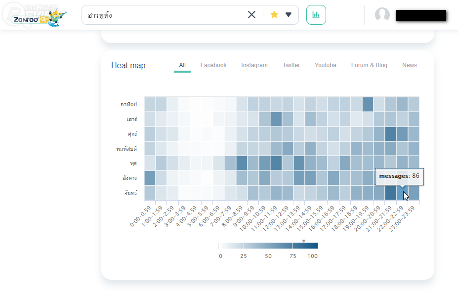 บนเสิร์ชเอนจินอื่นๆ เราอาจจะคุ้นเคยกับหมวดหมู่การค้นหาอย่าง รูปภาพ วิดีโอ ข่าว หรือใน Google Search จะมีเพิ่มหมวดแผนที่ เที่ยวบิน หนังสือ ฯลฯ เข้ามา แต่สำหรับ Zanroo Search จะแยกหมวดหมู่การค้นหาออกเป็นโซเชียลช่องทางต่างๆ ทั้ง Facebook, Instagram, Twitter, YouTube ไปจนถึง Forum และ Blog ต่างๆ ซึ่งเป็นการเจาะการหาข้อมูลไปทางโซเชียลอย่างชัดเจน