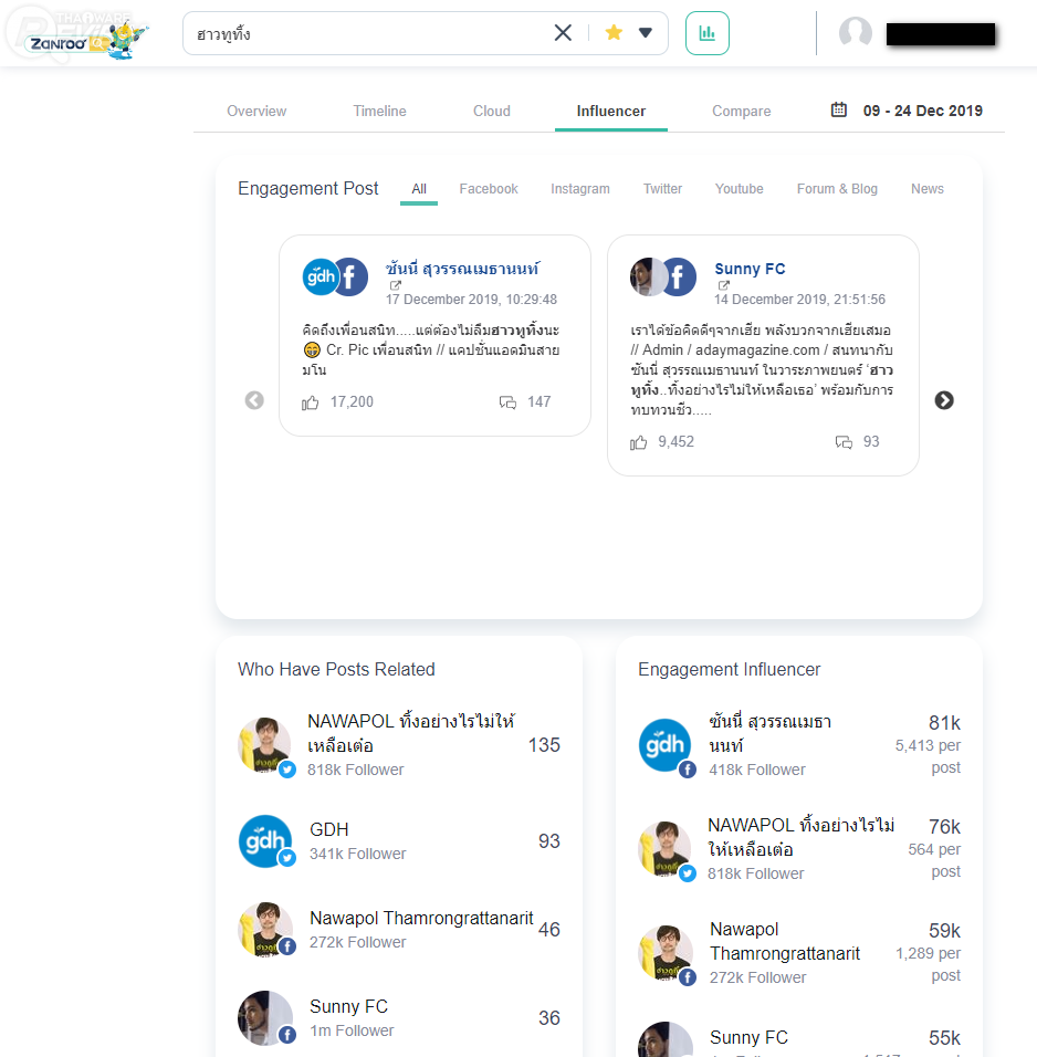 หากต้องการดูข้อมูลเฉพาะ Influrencer ก็มีแถบที่แสดงข้อมูลเฉพาะโพสต์จาก Influrencer ให้ใช้งานอยู่