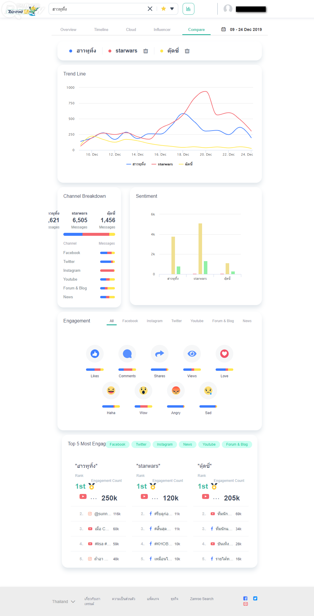 ไม่เพียงแค่ดูได้ว่าเทรนด์นั้นๆ ได้รับความสนใจมากน้อยแค่ไหน แต่ยังสามารถจำแนกออกไปอีกได้ว่า ผู้คนมีการแสดงความคิดเห็นต่อเรื่องนั้นๆ ในช่องทางต่างๆ ไปในทางบวกหรือลบมากแค่ไหน (Sentiment) หรือมีการตอบโต้อะไรบ้าง (Engagement)