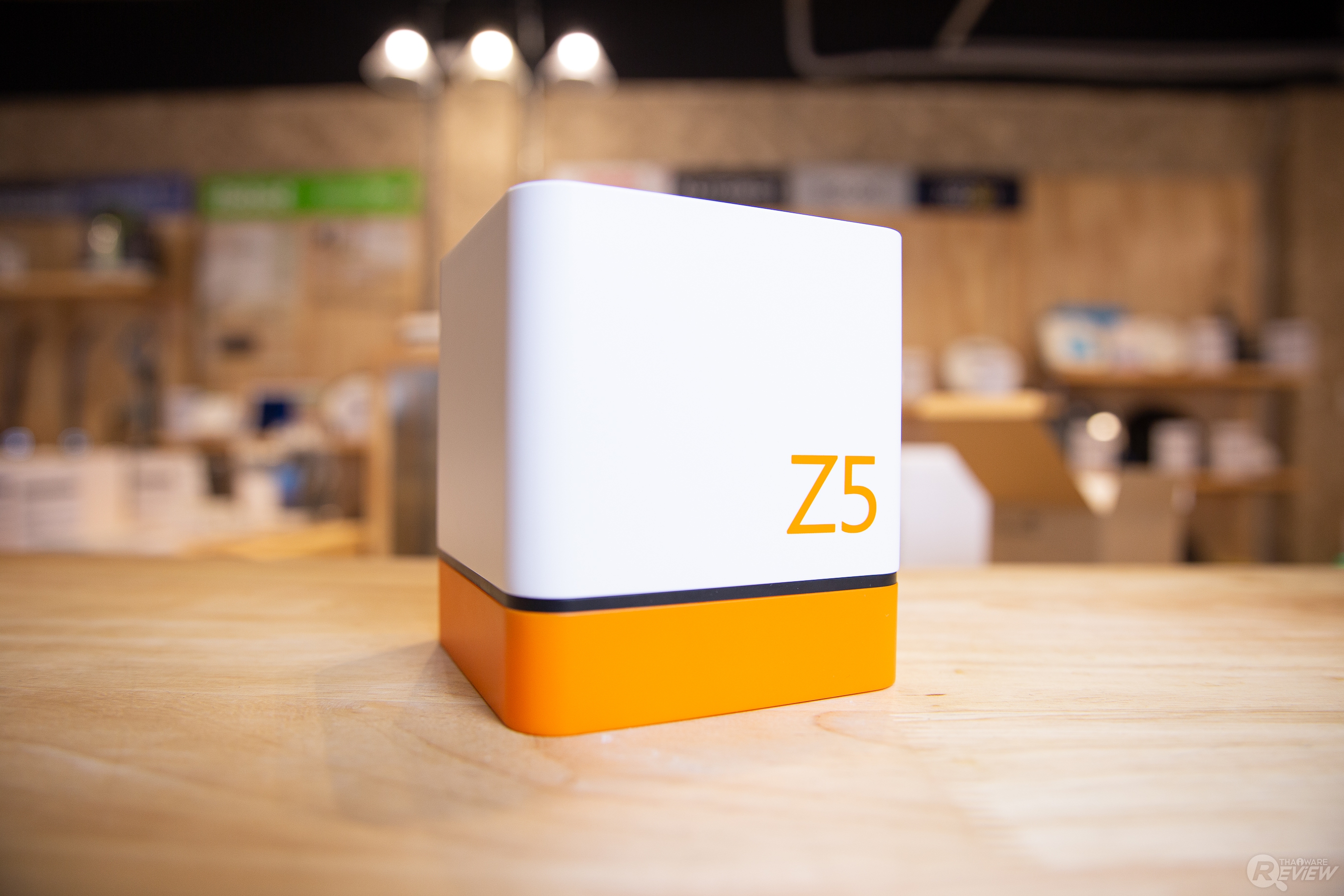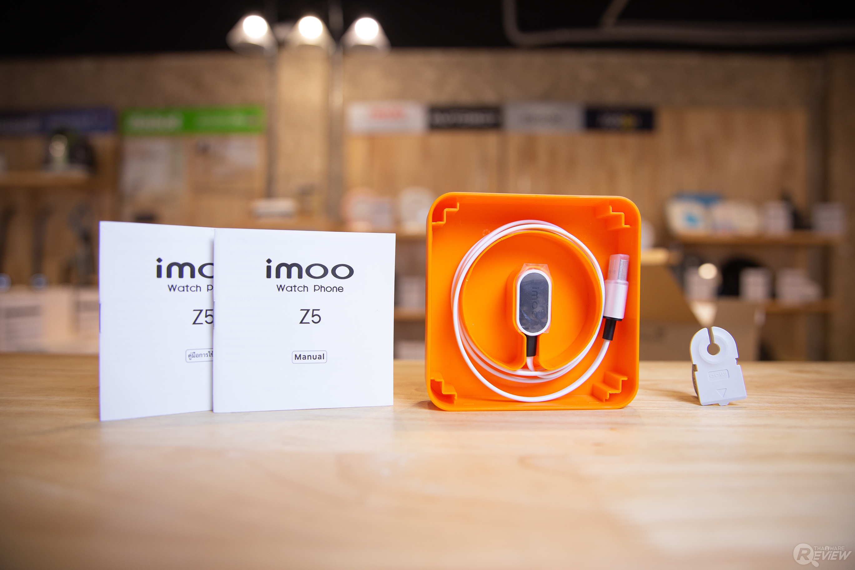กล่องแพ็คเกจของ imoo Watch Phone Z5 มาในรูปแบบกล่องลูกบาศก์สี่เหลี่ยมสีขาว ตัดด้วยลายสีส้มที่ดูเป็นเอกลักษณ์ เปิดกล่องออกมาจะเป็นแท่นวางนาฬิกา ส่วนอุปกรณ์ต่างๆ จะอยู่ส่วนฐานของกล่อง ที่ประกอบไปด้วย คู่มือการใช้งาน ใบรับประกัน สายแม่เหล็ก USB สำหรับชาร์จแบตเตอรี่ และที่ปลดล็อกช่องซิม