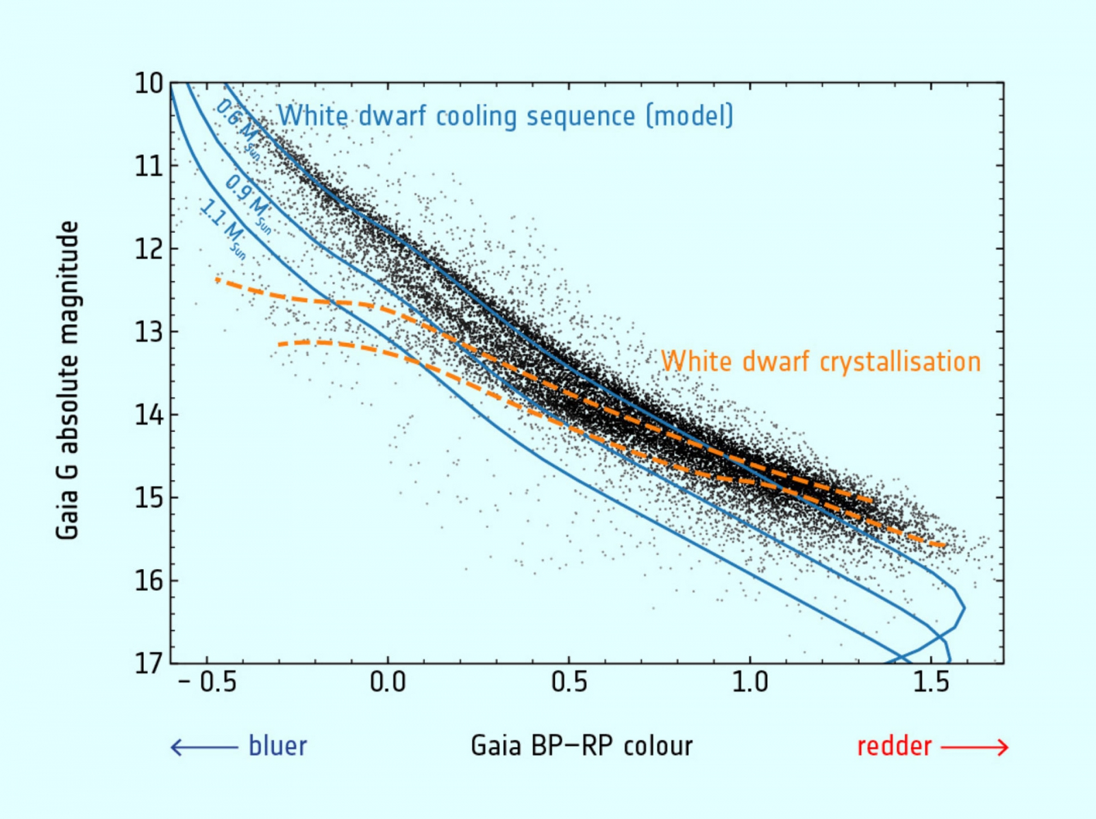 จากการสำรวจของดาวเทียม Gaia ทำให้นักดาราศาสตร์อนุมานกันได้ว่าการก่อตัวขึ้นของคริสตัลนั้นมาจากการที่ออกซิเจนเกิดการแข็งตัวและจมลงไปที่แกนกลางของดวงดาว จนเกิดการตกตะกอนลงไปเรื่อยๆ ทำให้คาร์บอนดันตัวลอยขึ้นสูง ซึ่งการแบ่งแยกของทั้งสองสิ่งนี้เองที่ทำให้เกิดพลังงานโน้มถ่วง แต่เราก็ได้เห็นว่าดาวแคระขาวหลายดวงมีการเปลี่ยนสีและการเปล่งแสงที่ไม่เชื่อมโยงกับวัฏจักรชีวิตของมัน ทำให้นักดาราศาสตร์ตระหนักได้ว่ามันไม่ได้มีเพียงแค่ขั้นตอนการแปรสภาพเป็นคริสตัลเพียงเท่านั้น แต่ดาวแคระขาวจำนวนหนึ่งนั้นอาจหยุดกระบวนการเย็นตัวและลดการปล่อยพลังงานโดยรอบลงกว่าร้อยปีหรือพันปีเลยทีเดียว ซึ่งในจุดนี้ก็ทำให้การทำนายอายุของดาวแคระขาวอาจเกิดการคลาดเคลื่อนไปได้